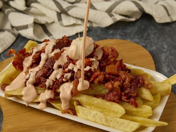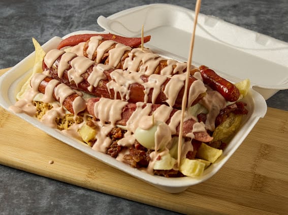 Pollo desmechado, tocineta,1 chorizo de ternera, 1 longaniza, 2 choricitos 2 salchichas. 2huevos y porciones de queso