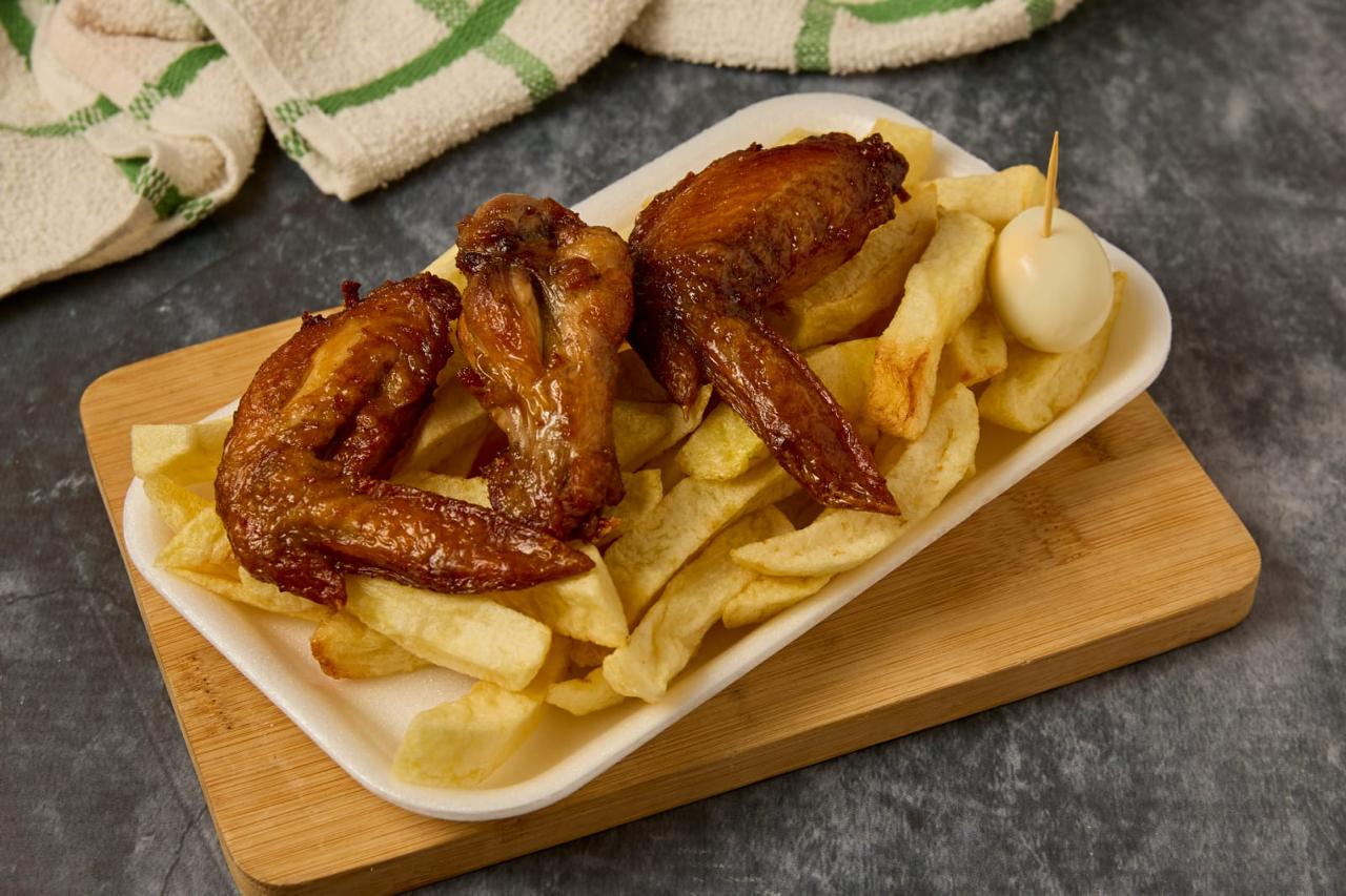 Carne, pollo, tocineta, 3 salchichas, 3 choricitos, 3 huevos.