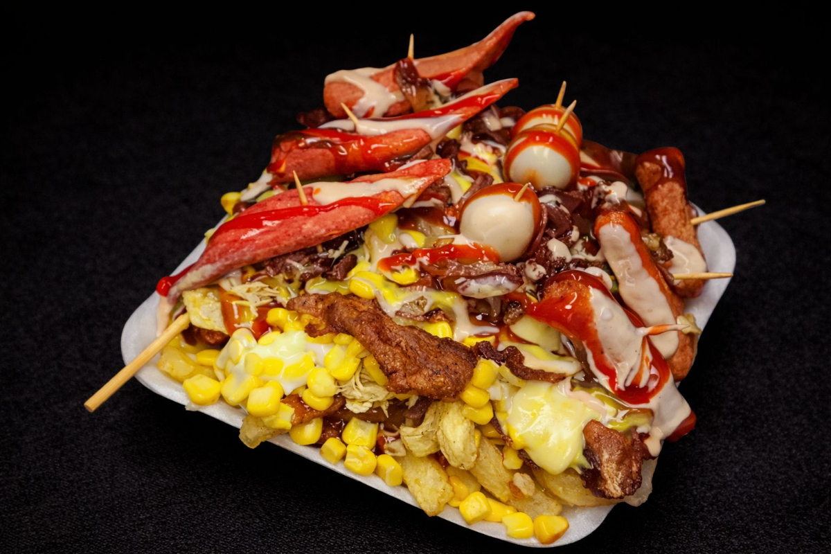 Deliciosas papas a la francesa acompañadas de queso, carne, pollo, 3 salchichas, 3 chorizos, 3 huevos de codorniz, 1 longaniza, tocineta y maíz.