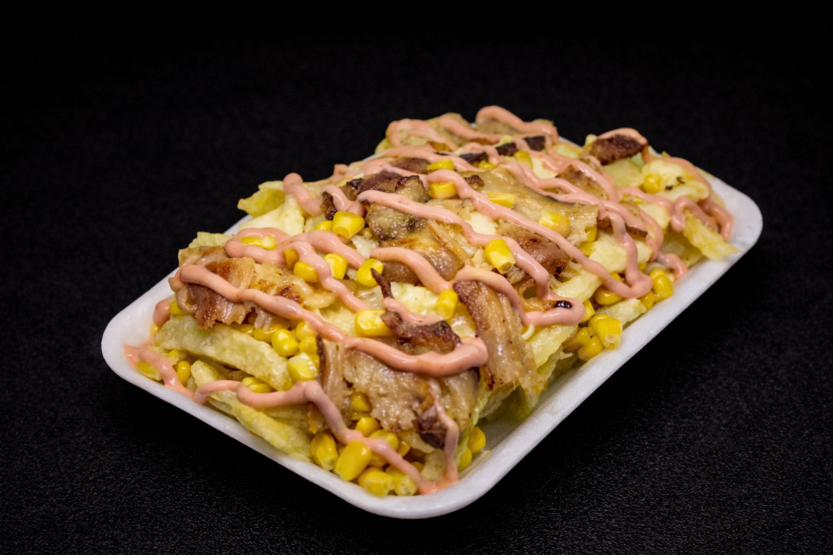 Deliciosas papas a la francesa acompañadas de tocineta, maicitos y queso.