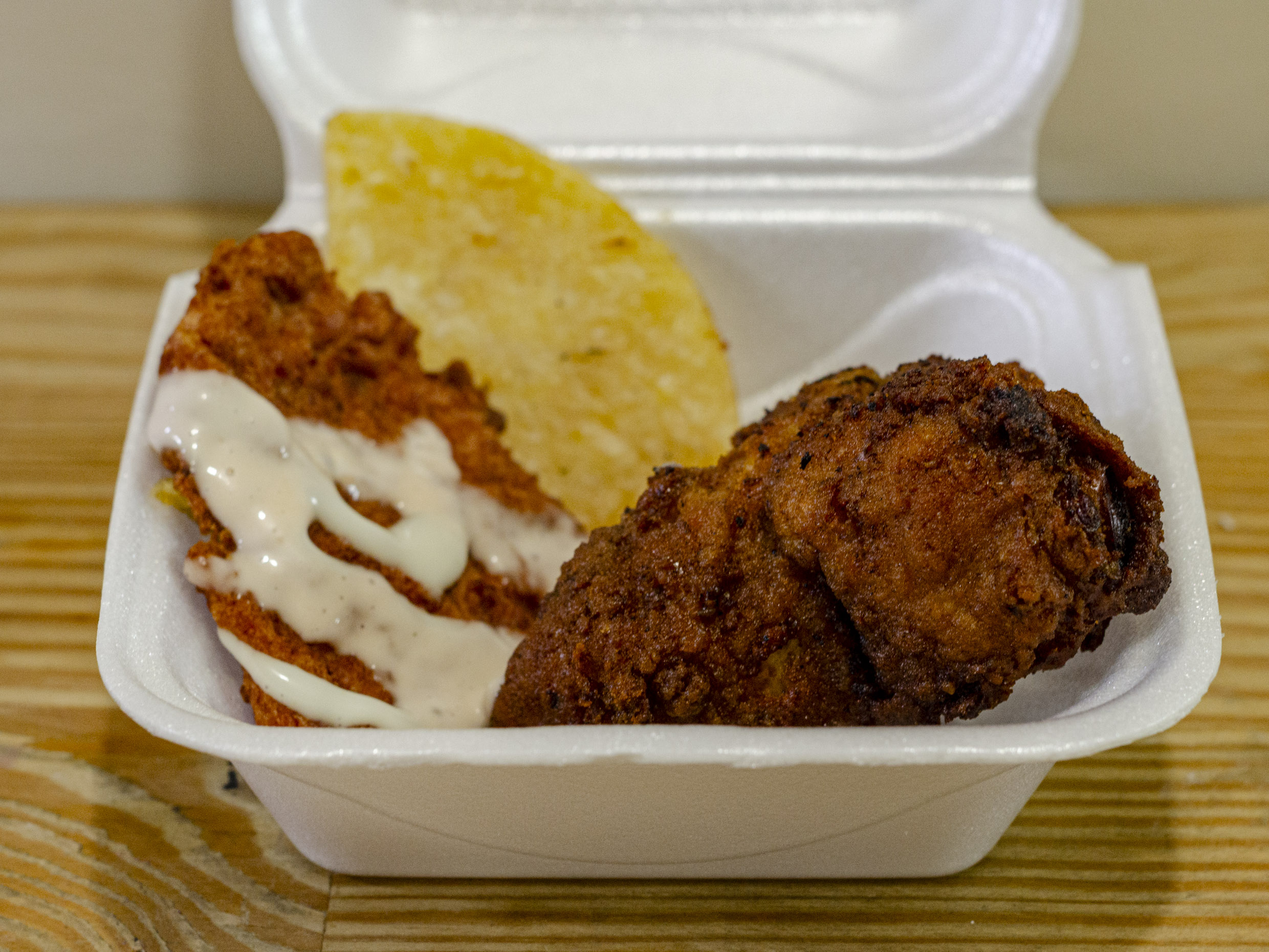Papas, bombón de pollo y arepa.