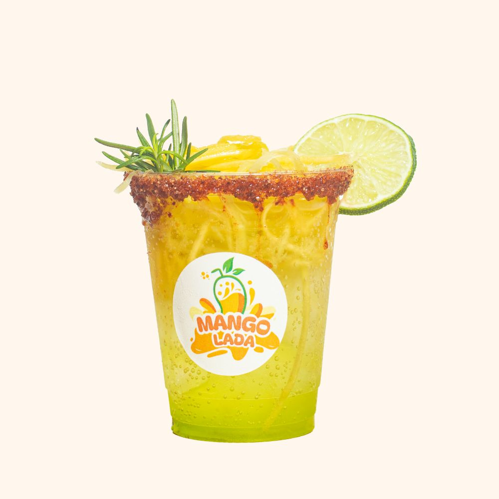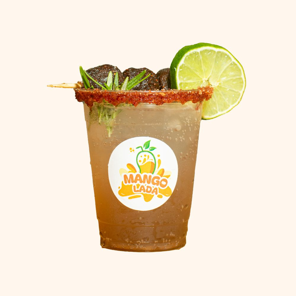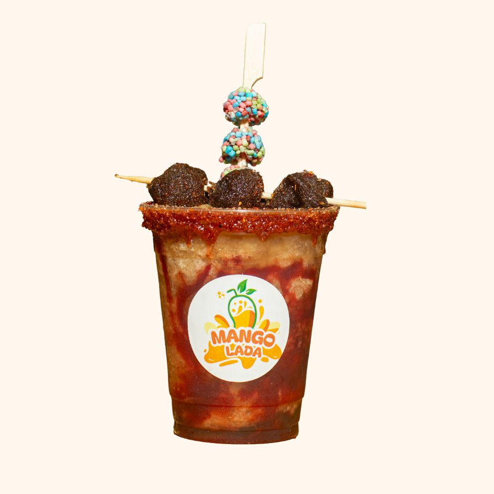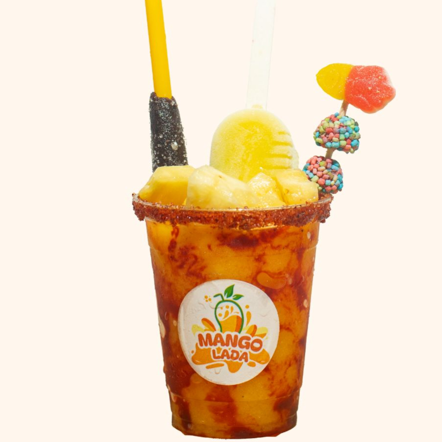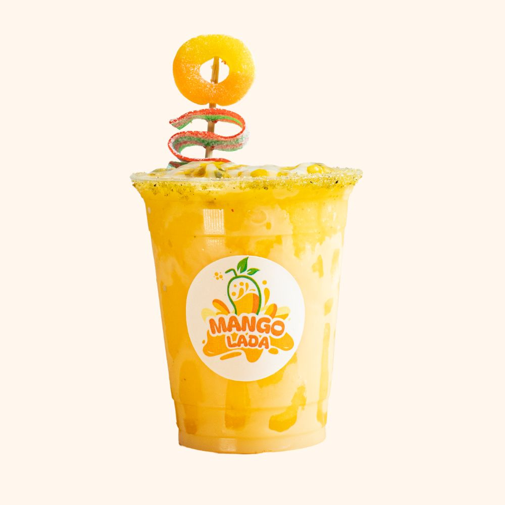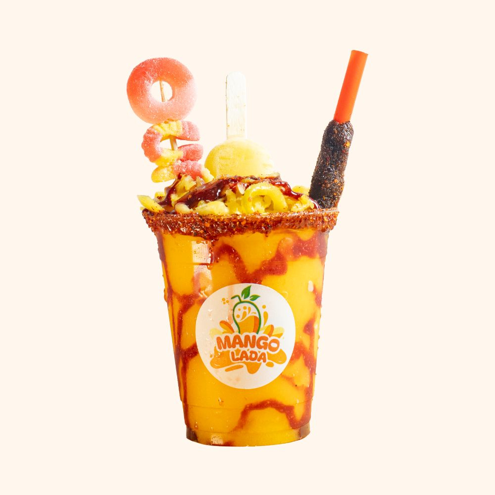 Frappé de mango con trozos de mango, mini paleta de mango, brocheta de gomitas y banderilla de tamarindo. Acompañado con limón, sal, pimienta, chilito, chamoy y tajin