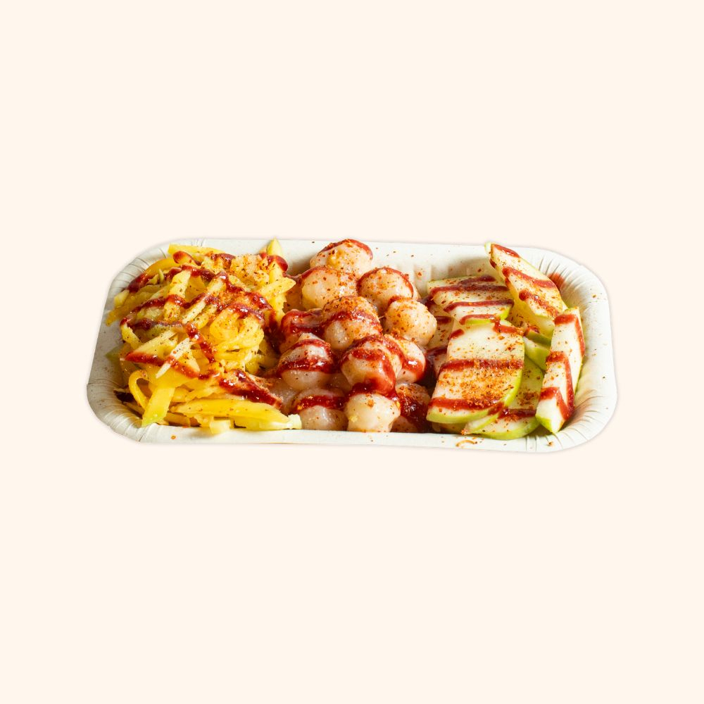 Bandeja ácida con Mango biche, manzana verde y mamoncillo. Acompañado de limón, sal, pimienta, chamoy, chilito y tajin
