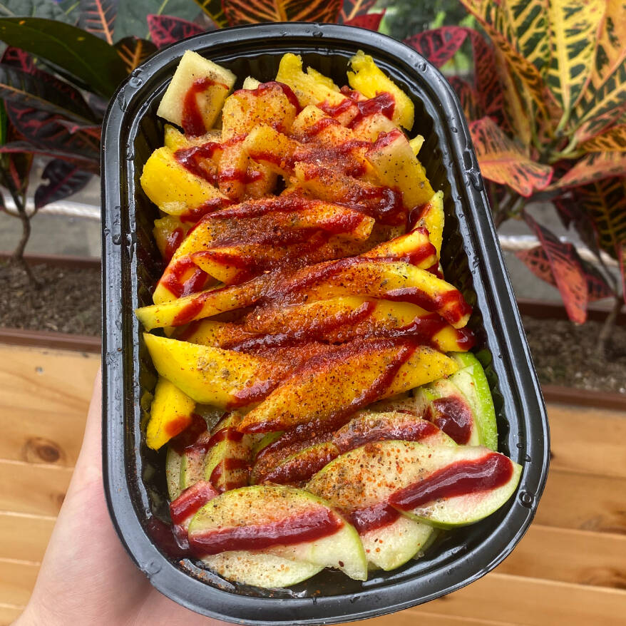 Mango rallado con manzana verde. Acompañado con limón, sal, pimienta, tajín, chilito y chamoy