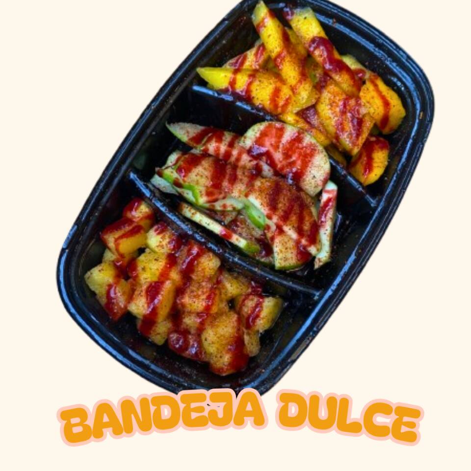 Bandeja dulce con piña, mango maduro, manzana. Acompañado de limón, sal, pimienta, chamoy, chilito y tajin