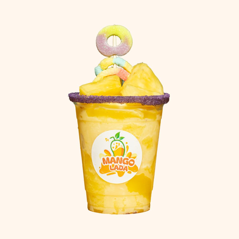 Frappé de maracumango con trozos de piña, mini paleta de mango, brocheta de gomitas y banderilla de tamarindo. Acompañado con limón, sal, pimienta, chilito, chamoy y tajin