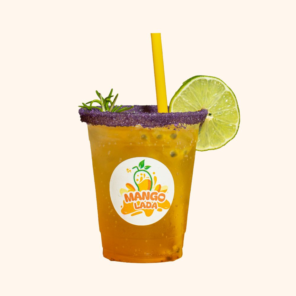 Soda con sirope de maracuyá, limón y pulpa de maracuyá, decorada con hierba aromática y una tajadita de limón