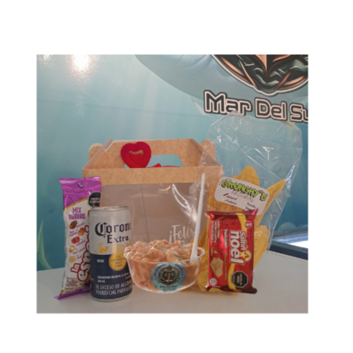 Un ceviche de camarón fresco y delicioso, preparado con camarones , diferentes especias, limón, salsa roja, mayonesa, cebolla y un toque de cilantro que realza su sabor. Este exquisito plato viene acompañado de dos cervezas bien frías, el acompañante de tu preferencia (platanitos o galletas ) y un paquete de maní que completa la experiencia.