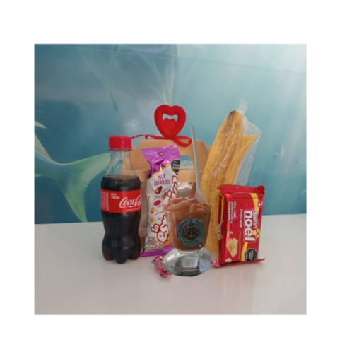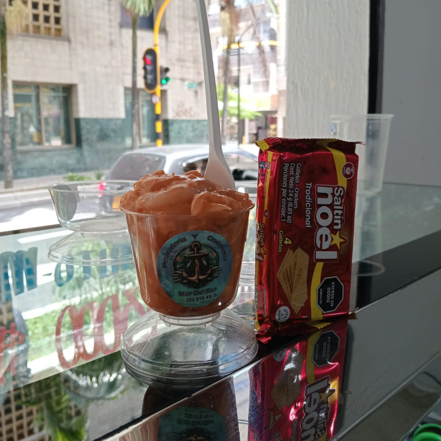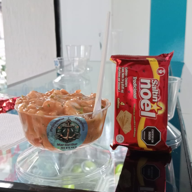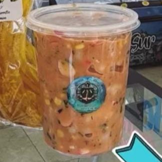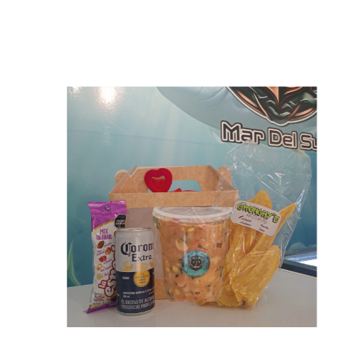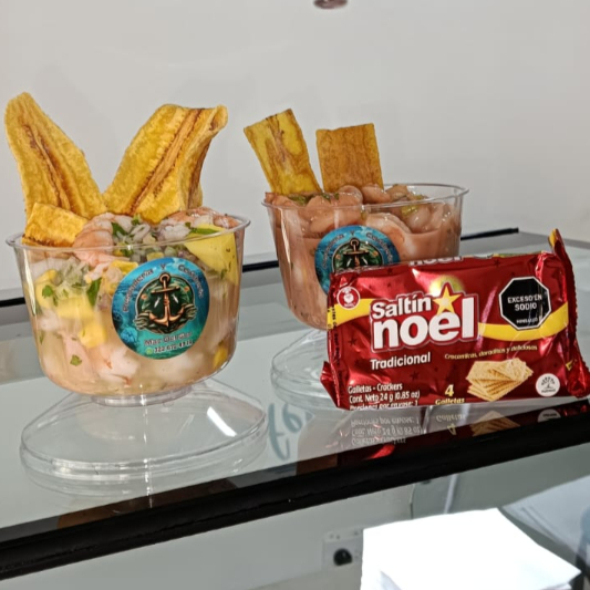 Un ceviche de camarón fresco y delicioso, preparado con camarones , diferentes especias, limón, salsa roja, mayonesa, cebolla y un toque de cilantro que realza su sabor. Este exquisito plato viene acompañado de una Coca-Cola bien fría, el acompañante de tu preferencia (platanitos o galletas ) y un paquete de maní que completa la experiencia.
