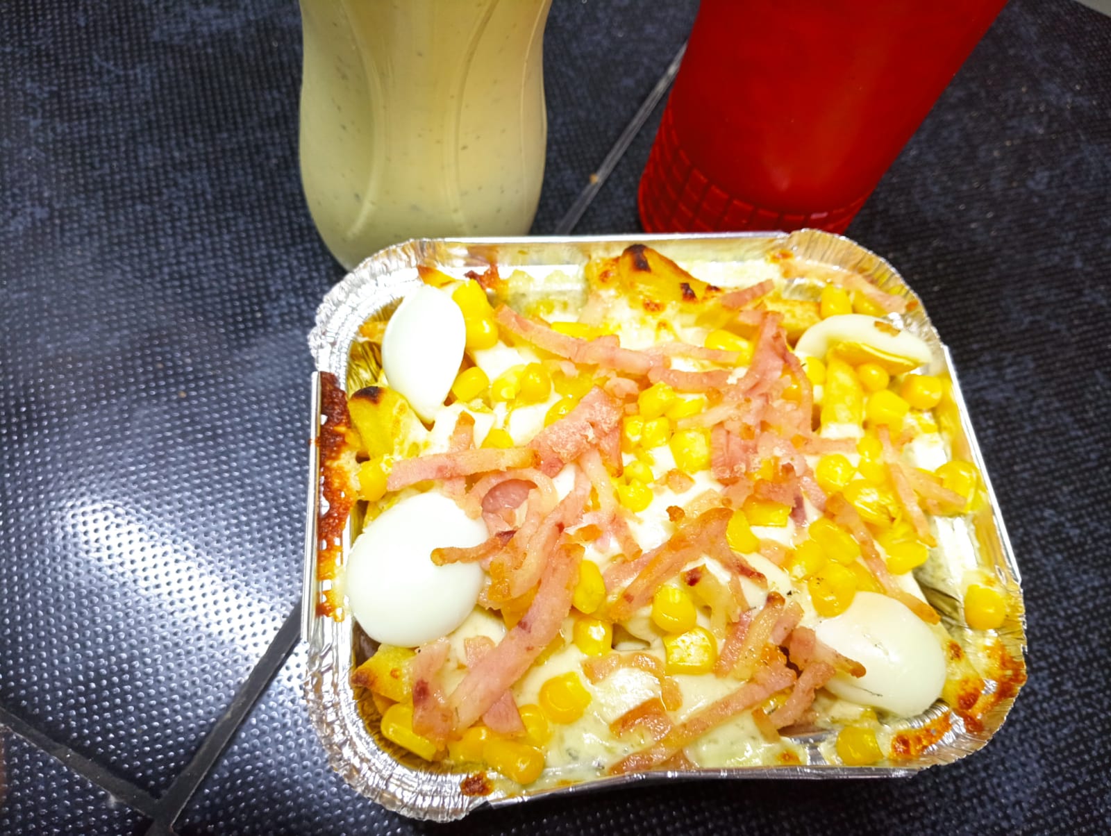 Salsa de la casa, maiz tierno,queso,pollo y tocineta