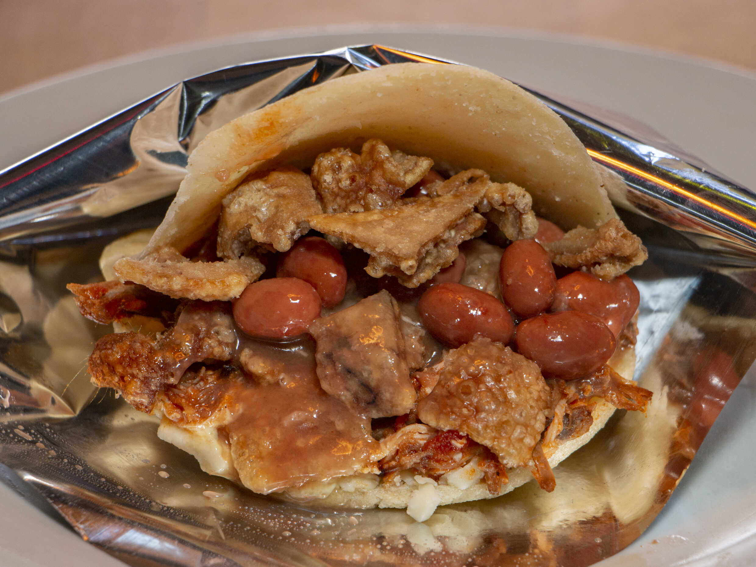 Queso, pollo, chicharrón, chorizo, carne desmechada, y cebolla caramelizada