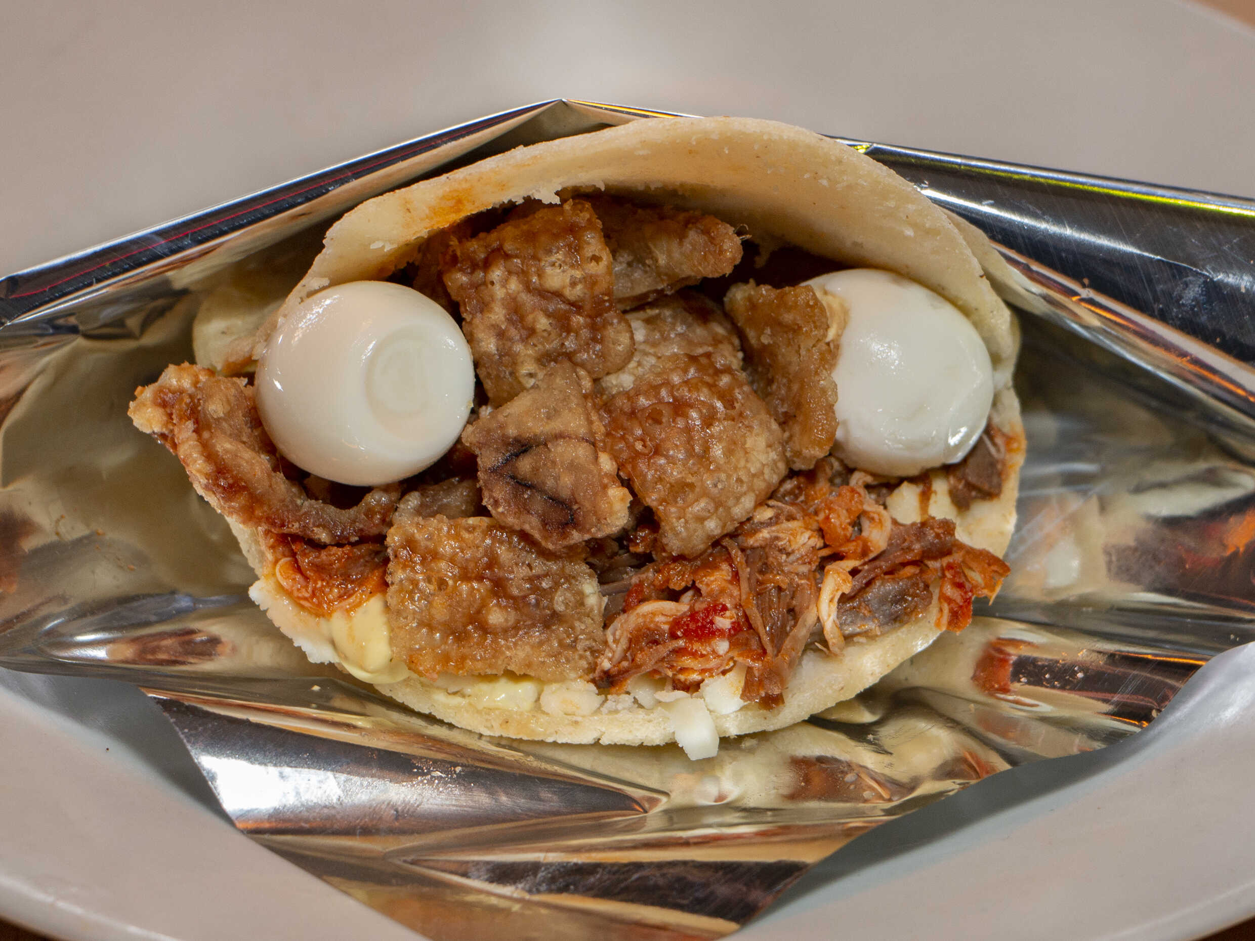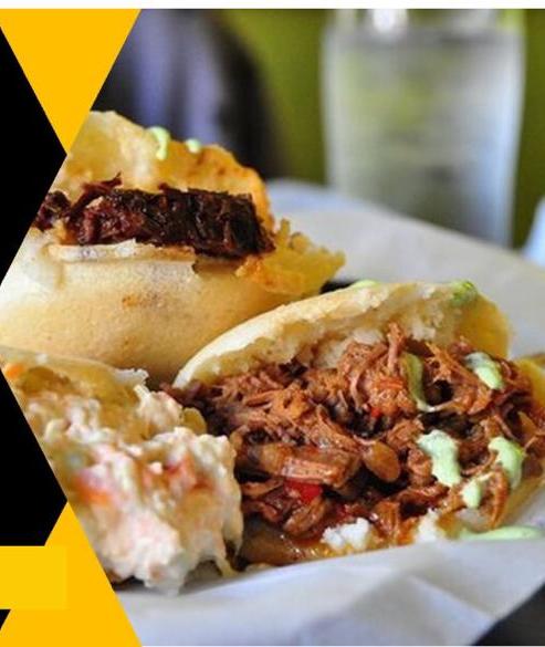 Queso, chicharrón, guacamole, carne desmechada, pollo, maduritos, huevo de codorniz (para aplicar la porción tienes que seleccionar 2 arepas para aplicar ala promocion)