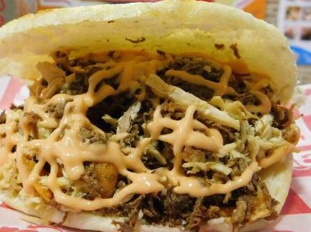Queso, pollo, carne desmechada y salsa rosada