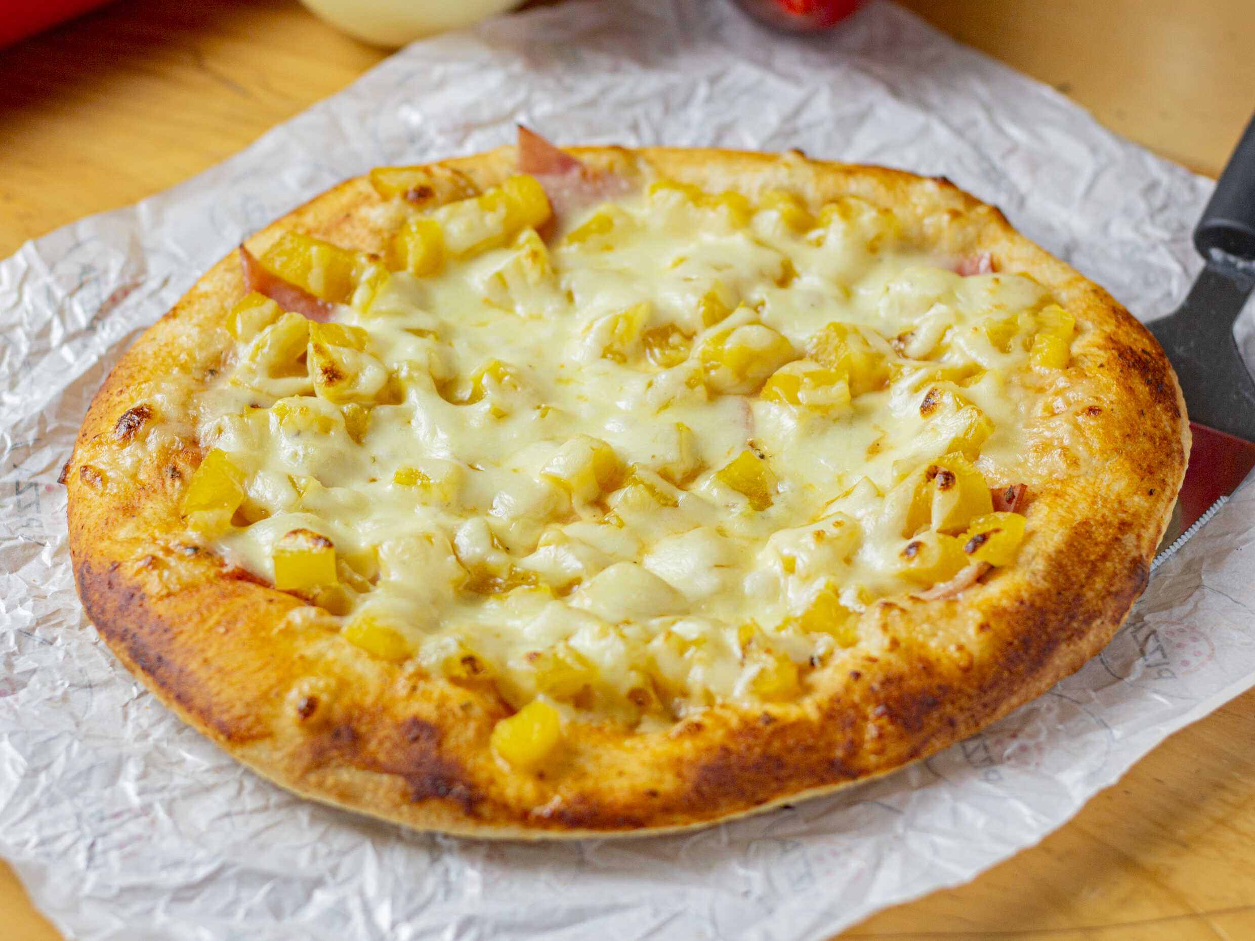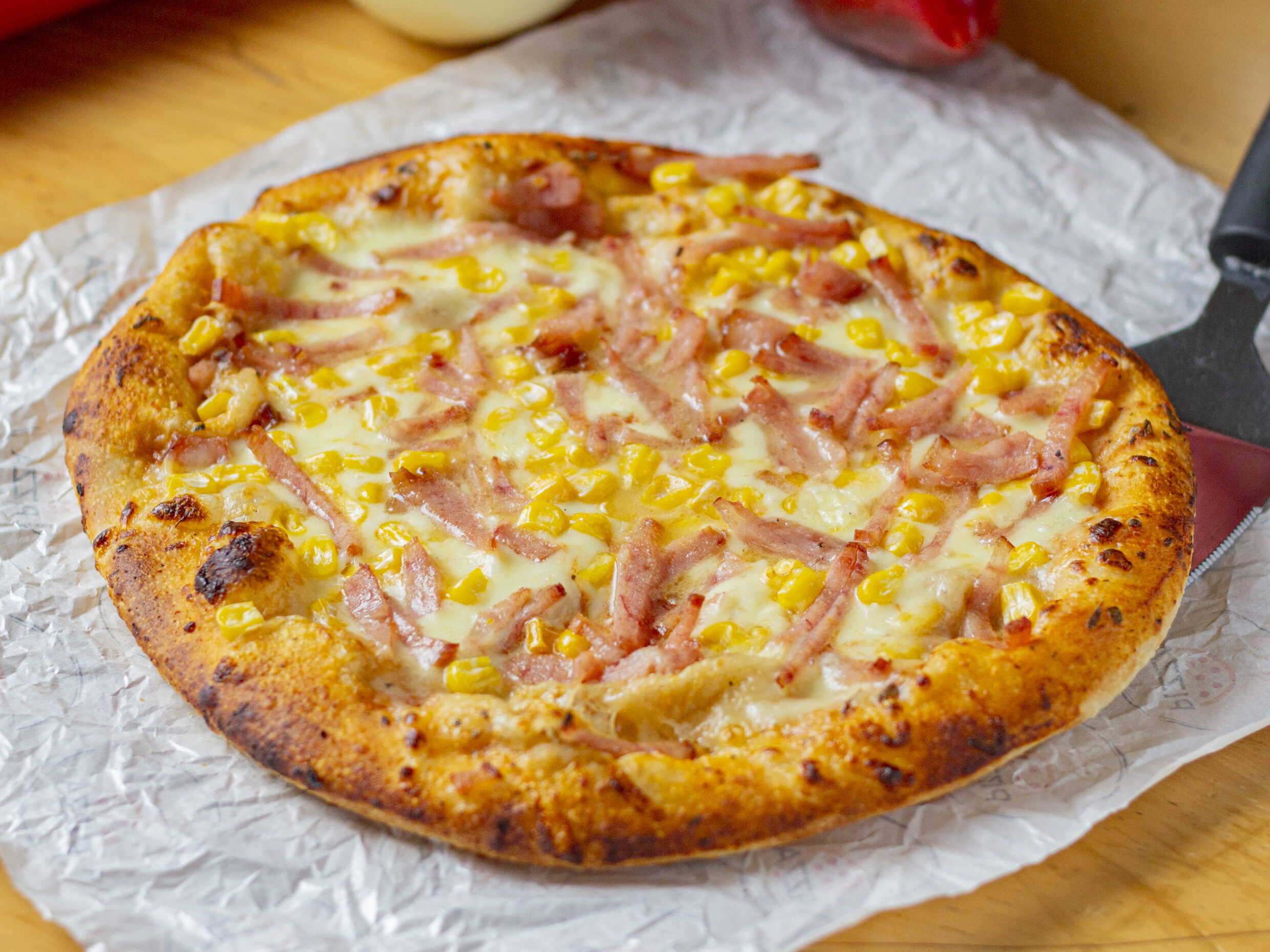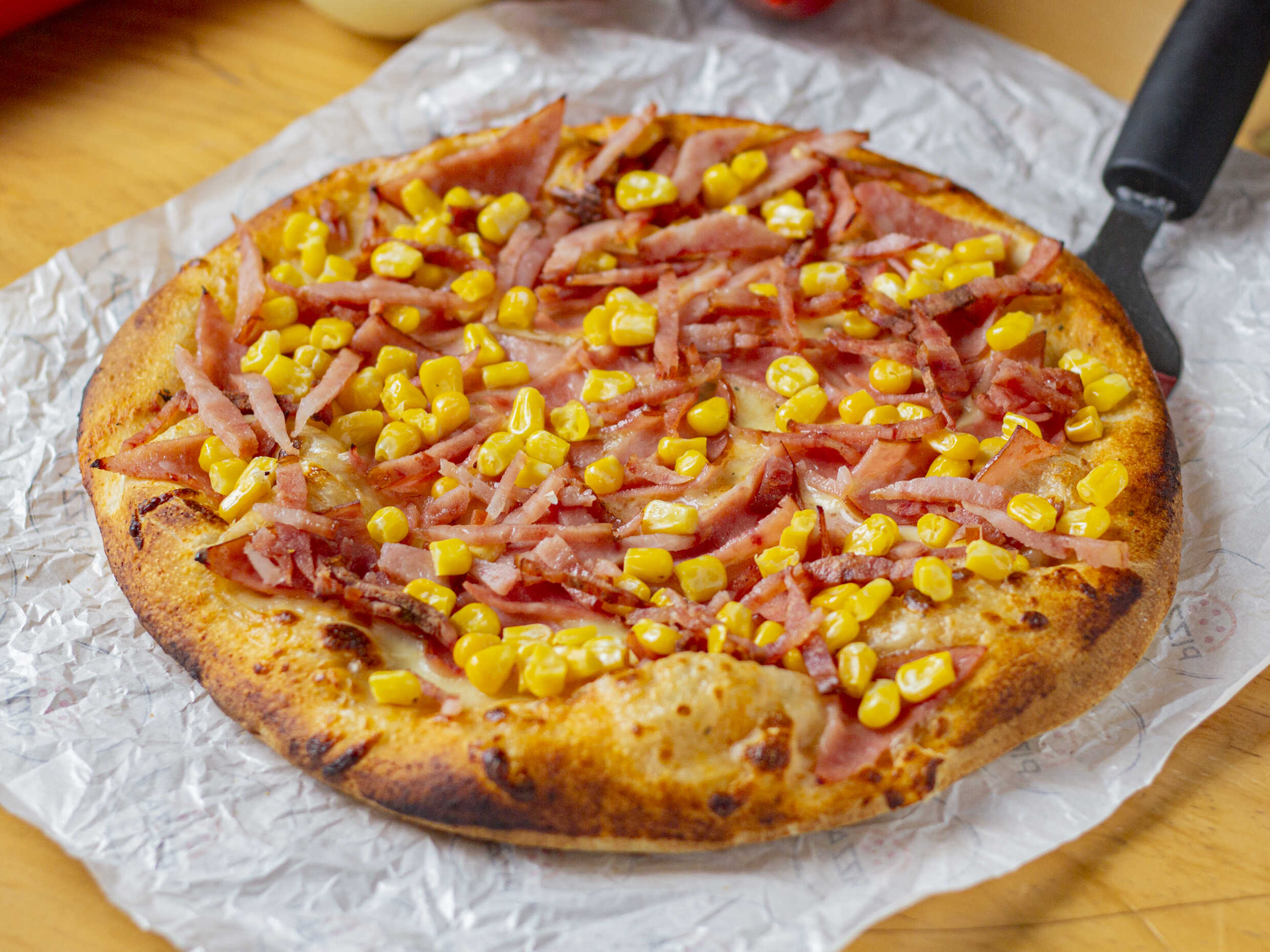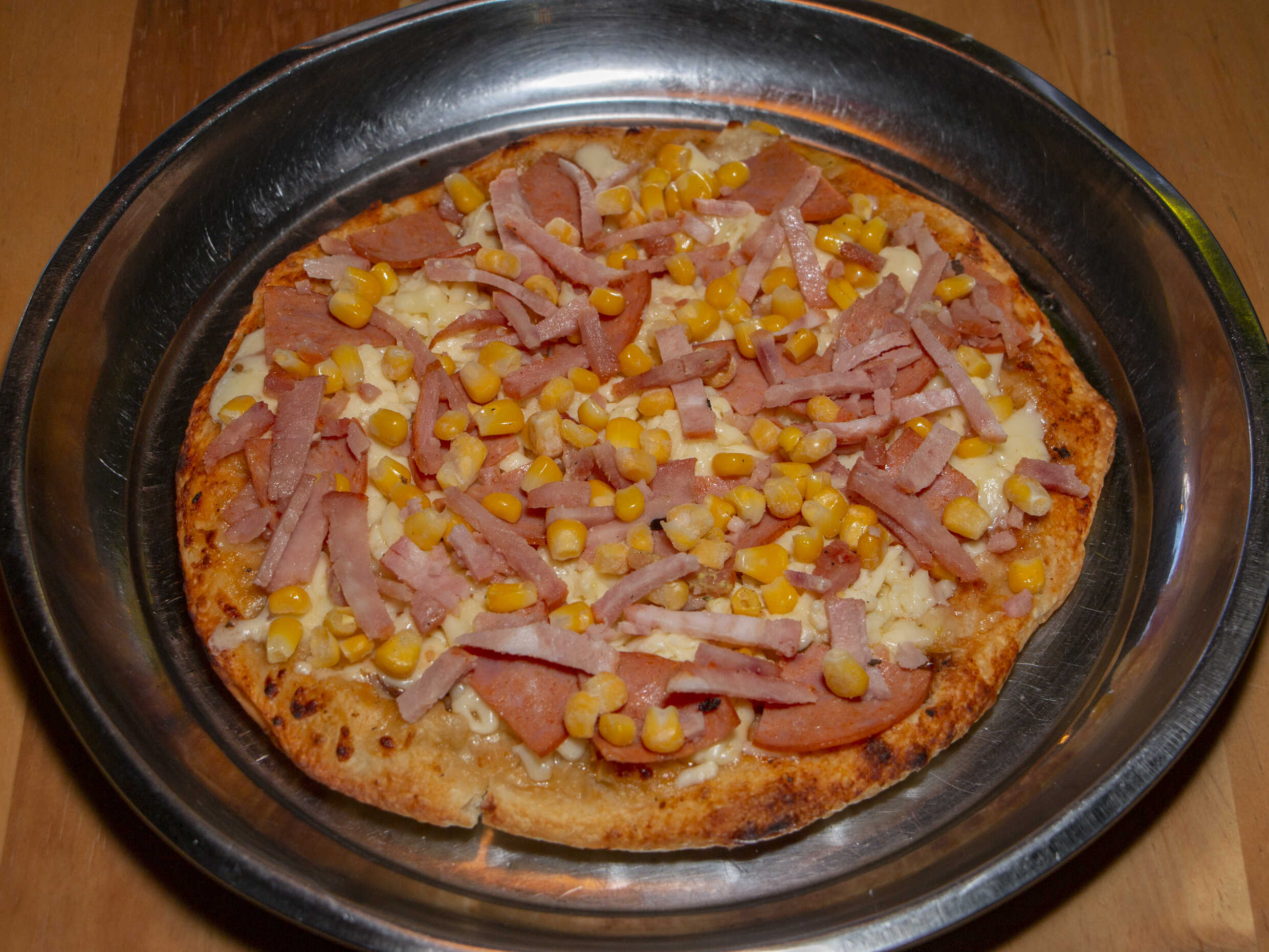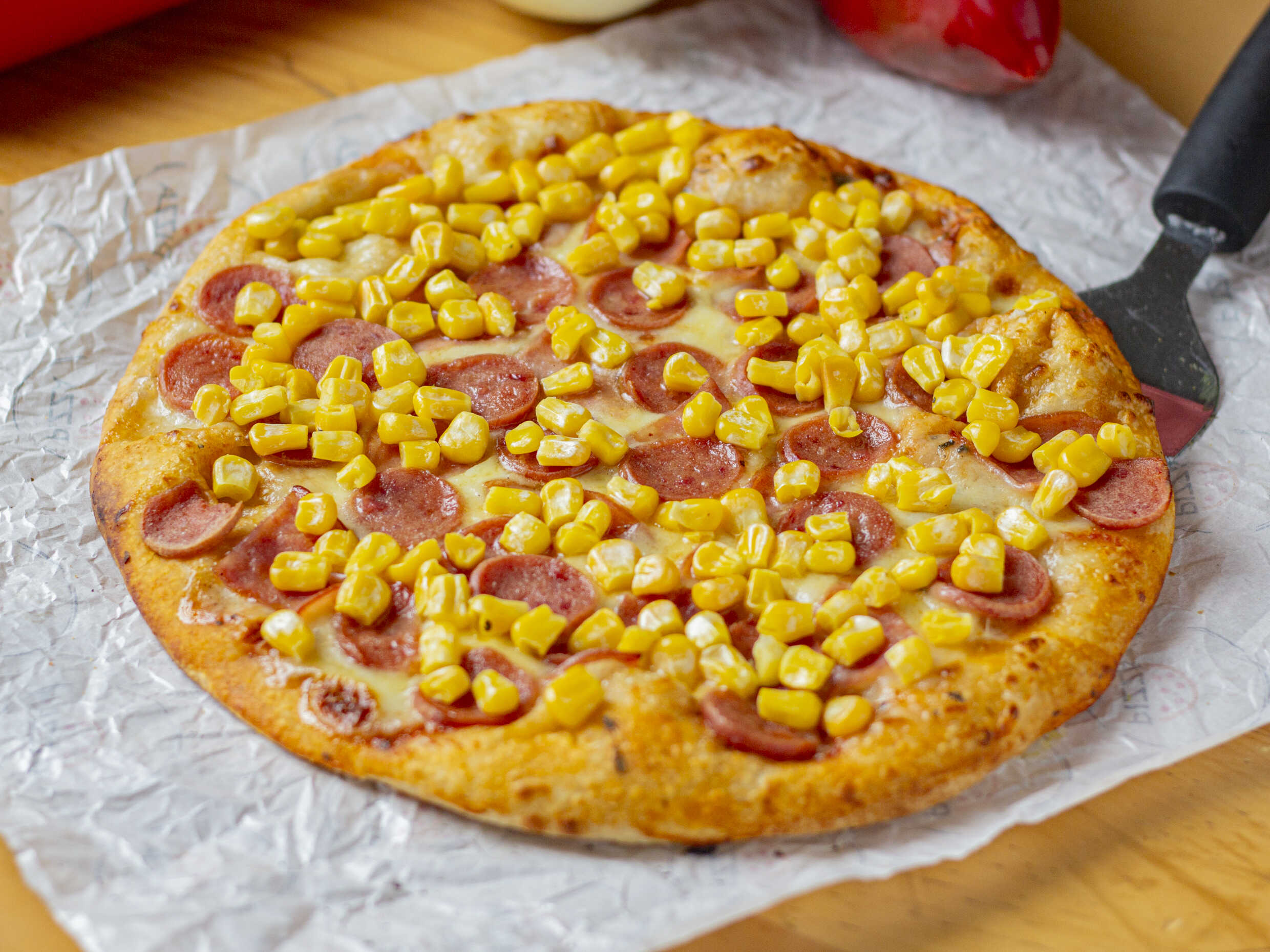 4 porciones, Queso, maíz, tocineta, peperoni.