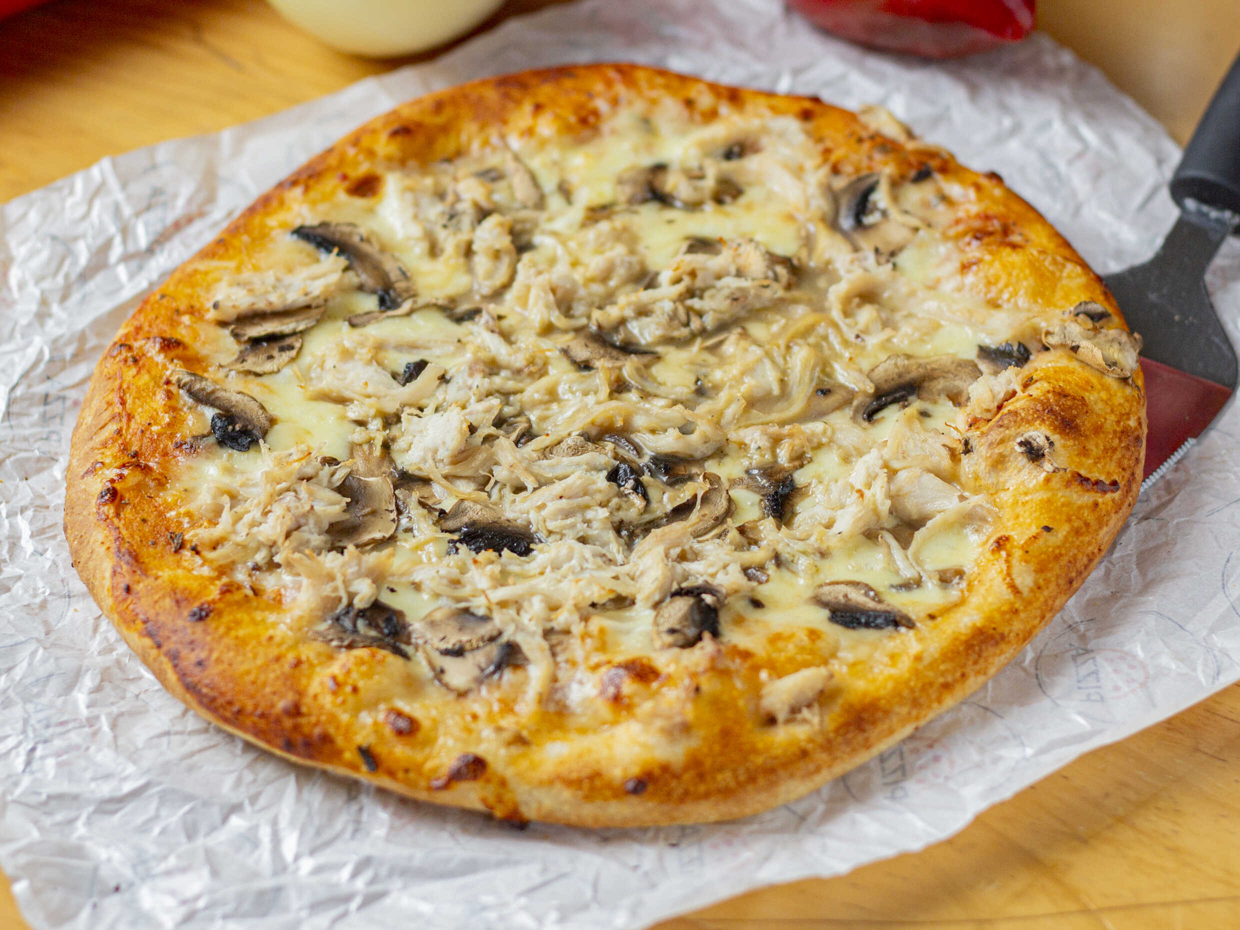 Queso, pollo, champiñón.