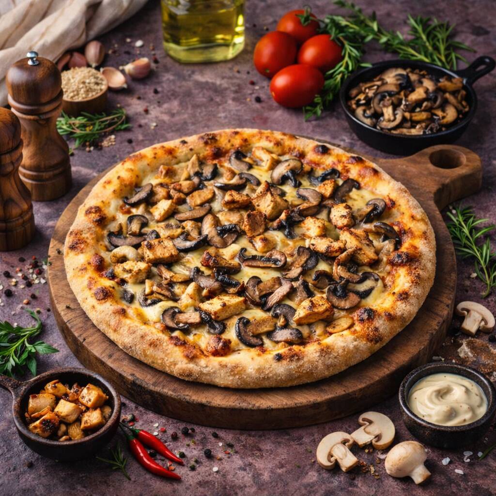 Pizza napolitana artesanal con masa fermentada 24h (baja en gluten). Salsa de tomate San Marzzano, mozzarella, pollo a la brasa y champiñones. Tamaño 30cm, 8 porciones