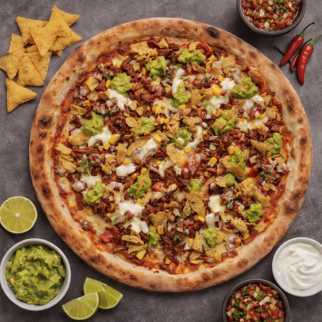 Pizza napolitana artesanal, con masa fermentada 24h (baja en gluten), salsa de tomate San Marzano, mozzarella, birria, crema agria, guacamole, pico de gallo y tostacos. Tamaño 30cm, 8 porciones.