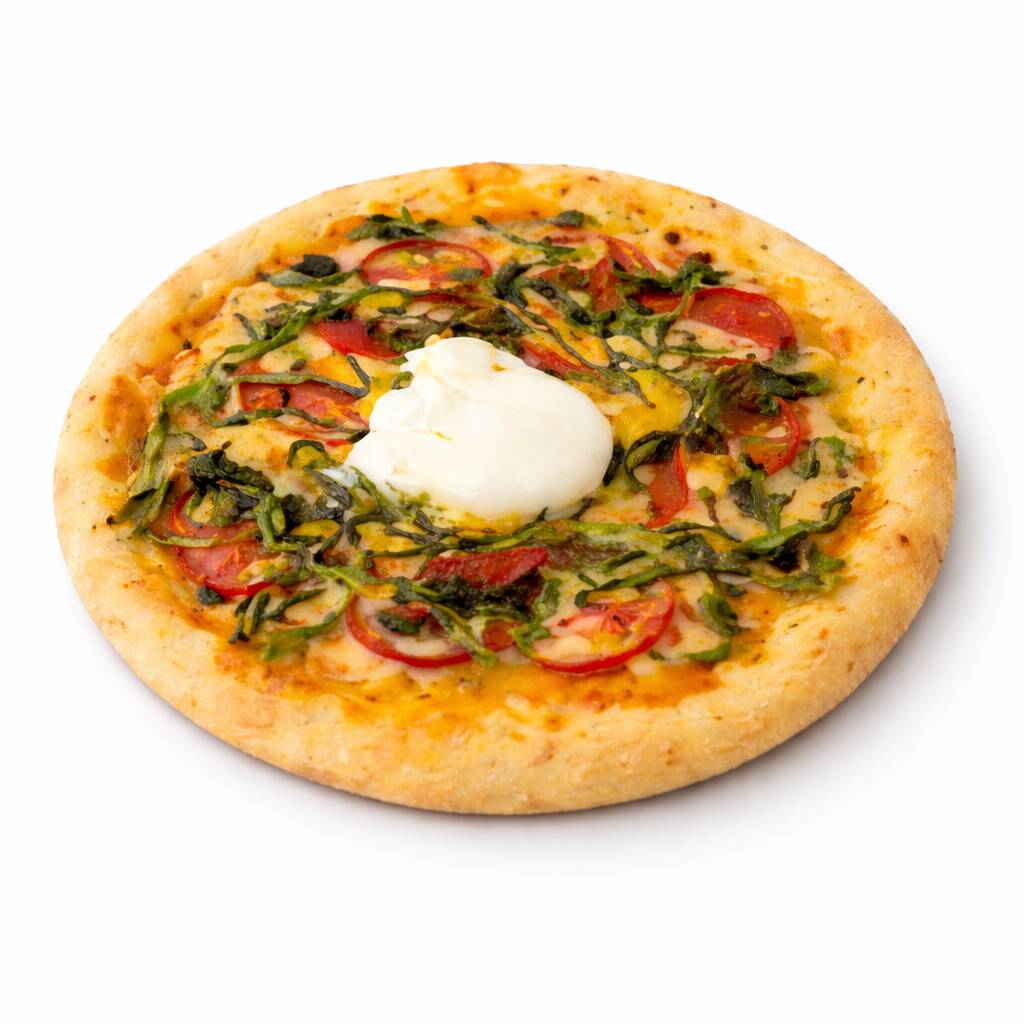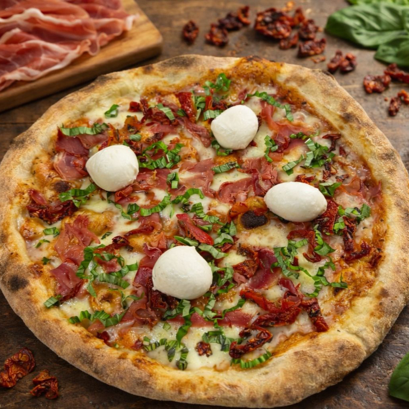 Pizza Napolitana con masa fermentada 24h (baja en gluten), Queso Mozzarela, Jamón Serrano, tomate seco y Burrata. Tamaño 30cm, 8 porciones.
