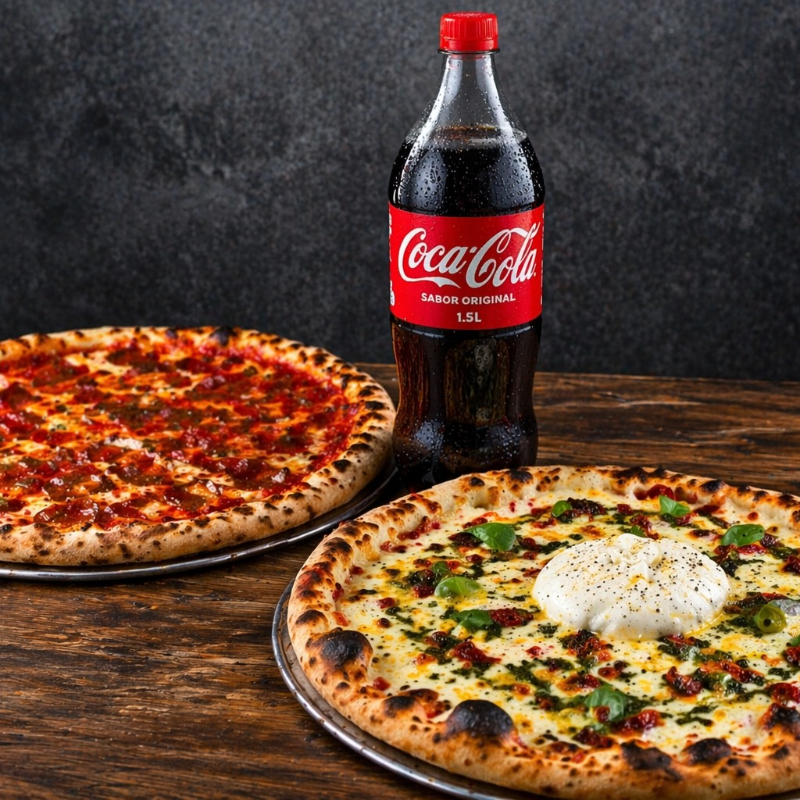 2 pizzas + bebida 1.5L. Ideal para 3 o 4 personas