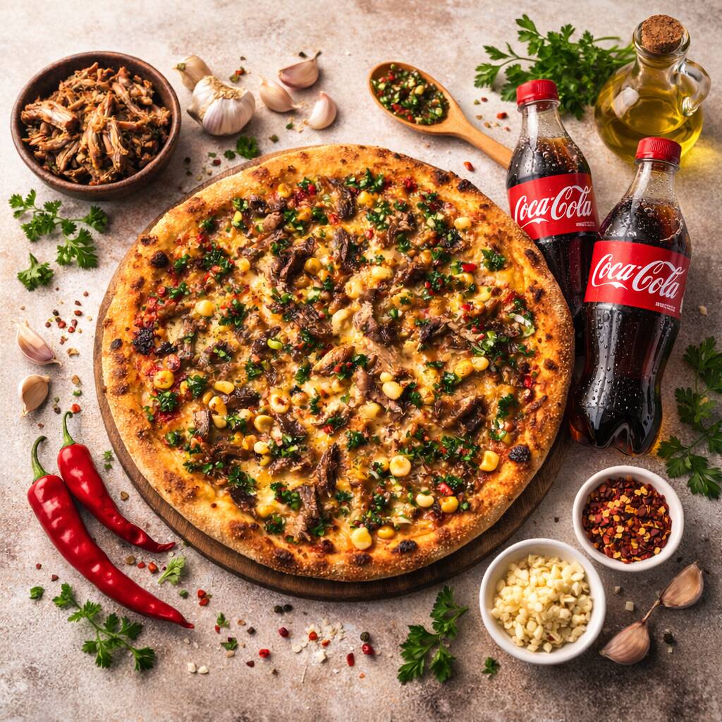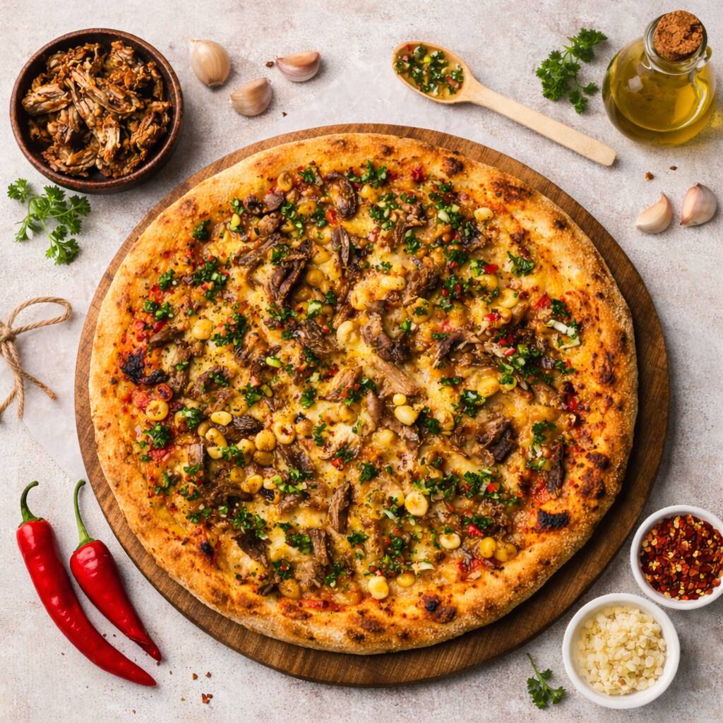 Pizza napolitana artesanal con masa fermentada 24h (baja en gluten). Salsa de tomate San Marzano, Mozzarella, cerdo parrillado, maíz y chimichurri. Tamaño 30cm, 8 porciones