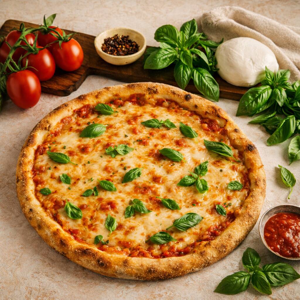 Pizza napolitana artesanal con masa fermentada 24h (baja en gluten). Salsa de tomate San Marzano, mozzarella y brotes de albahaca. Tamaño 30cm, 8 Porciones