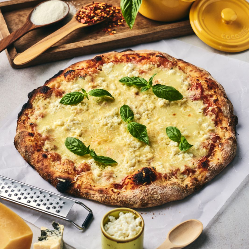 Pizza artesanal con masa fermentada 24h (baja en gluten). Salsa de tomate San Marzano, Mozzarella, queso azul, ricotta y parmessano.Tamaño 30cm, 8 porciones.