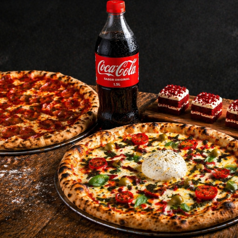2 pizzas + bebida 1.5L + 3 postres