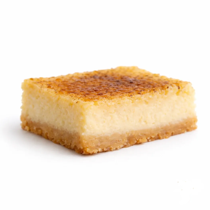 Suave y cremoso cheesecake horneado sobre base crocante de galleta, coronado con una fina capa de azúcar caramelizada al estilo creme brulee. Una combinación irresistible entre la textura sedosa del cheeseckae y toque crujiente del caramelo tostado