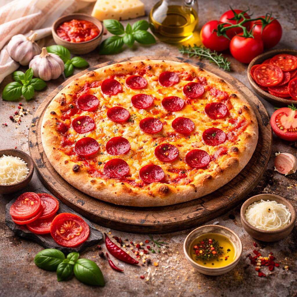 Pizza napolitana artesanal con masa fermentada 24h (baja en gluten). Salsa de tomate San Marzano, Mozzarella y pepperoni. Tamaño 30cm, 8 porciones