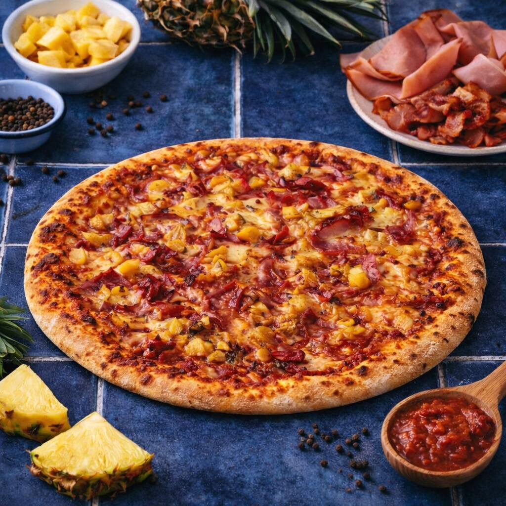 Pizza napolitana artesanal con masa fermentada 24h (baja en gluten). Salsa de tomate San Marzano, Mozzarela, Piña, jamón y tocineta crujiente. Tamaño 30cm, 8 porciones