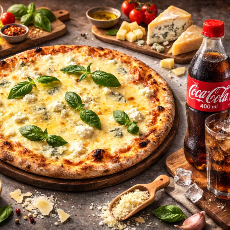 Pizza cuatro quesos (queso crema, queso azul, parmesano, ricota) + 1 Bebida