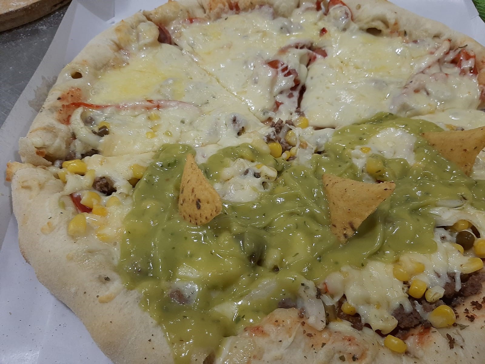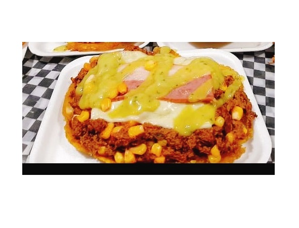 Queso, carne molida, tomate, maíz tierno, jalapeños, cebolla y guacamole.