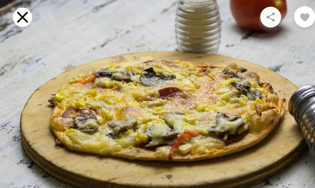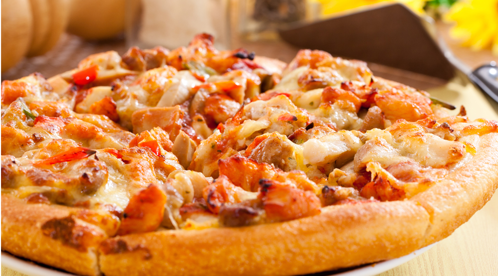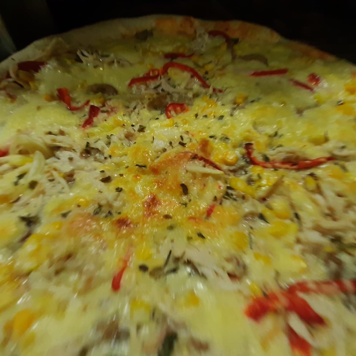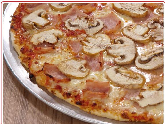 Queso, champiñones, pollo, pepperoni, maíz, tierno, cebolla y pimentón.