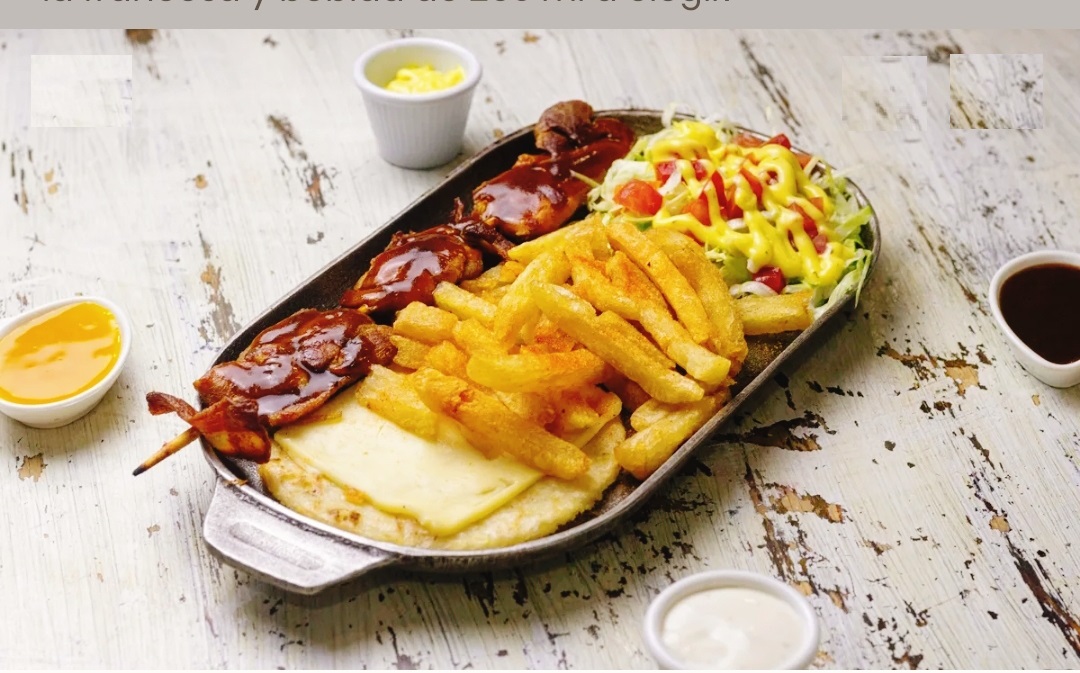 Recibirás: 2 patacones con carne, pollo, maicitos, tocineta, queso, guacamole, acompañado de papas a la francesa.