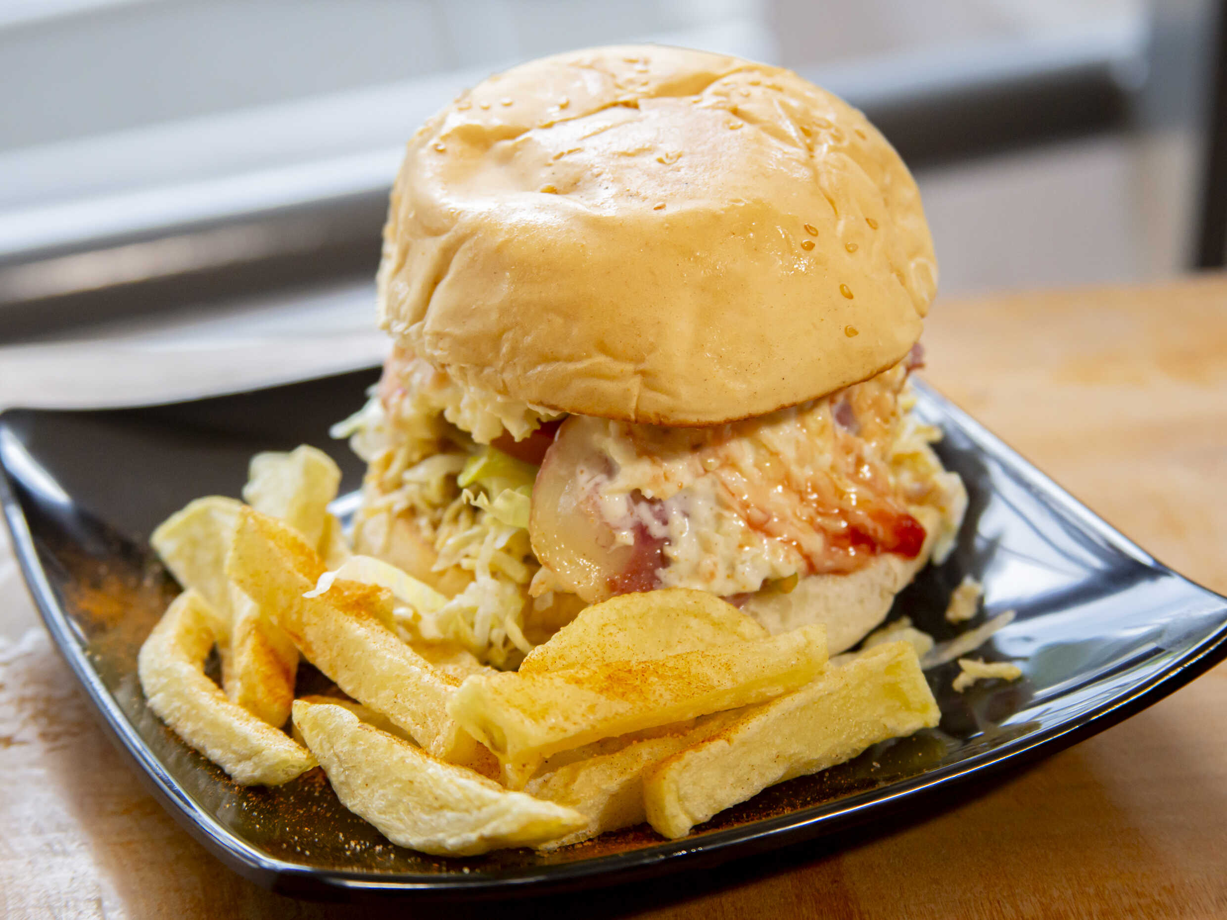 Carne de res, tocineta, queso, acompañado de papas a la francesa.