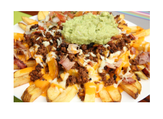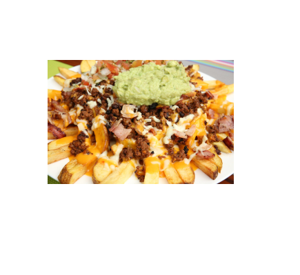 Este platillo incluye: Papas mexicanas a la francesa , con carne de res molida , pollo desmechado, salsa de ajo, ensalada pico de gallo, guacamole, jalapeño.