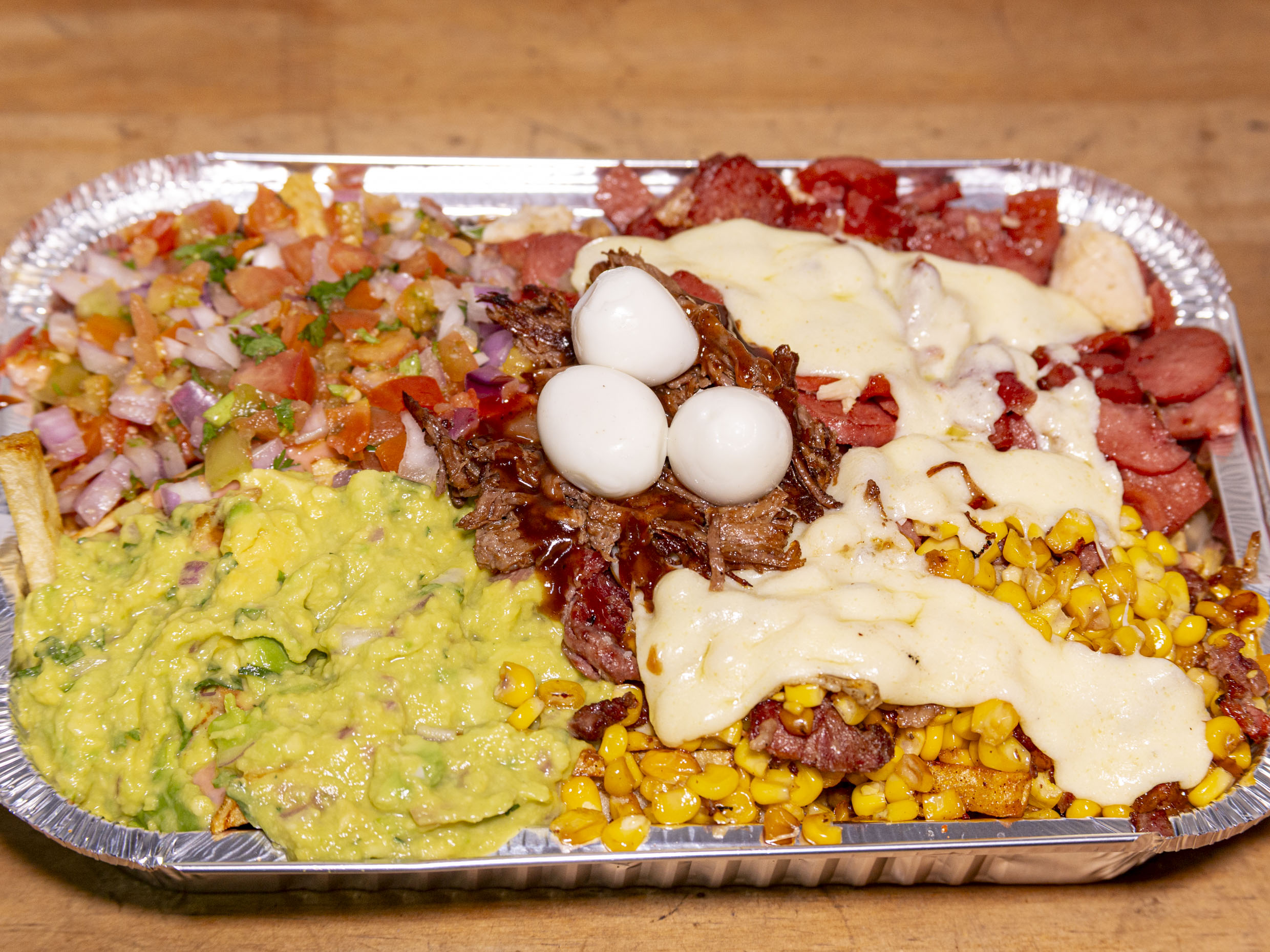 Picada mix mixta para 3 personas, con papas a la francesas, salchichas, ensalada, pico e gallo, guacamole, maíz, full queso, tocineta, carne desmechada, 3 huevos de codorniz, acompañada de salsas a eleccion