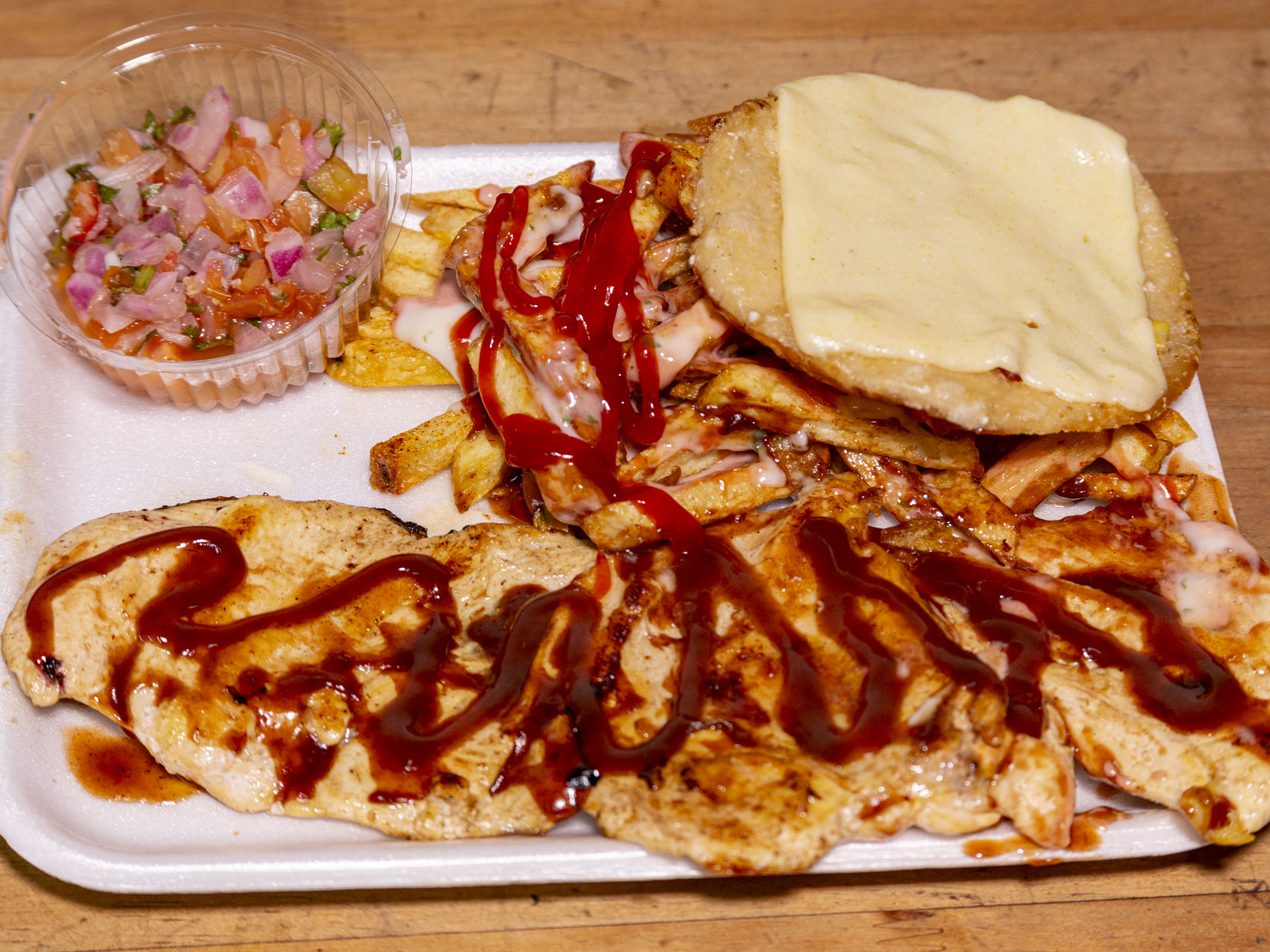 Platillo personal: pechuga de pollo asada, acompañada de una porción de papas a la francesa, arepa asada con queso mozzarella y ensalada pico de gallo.