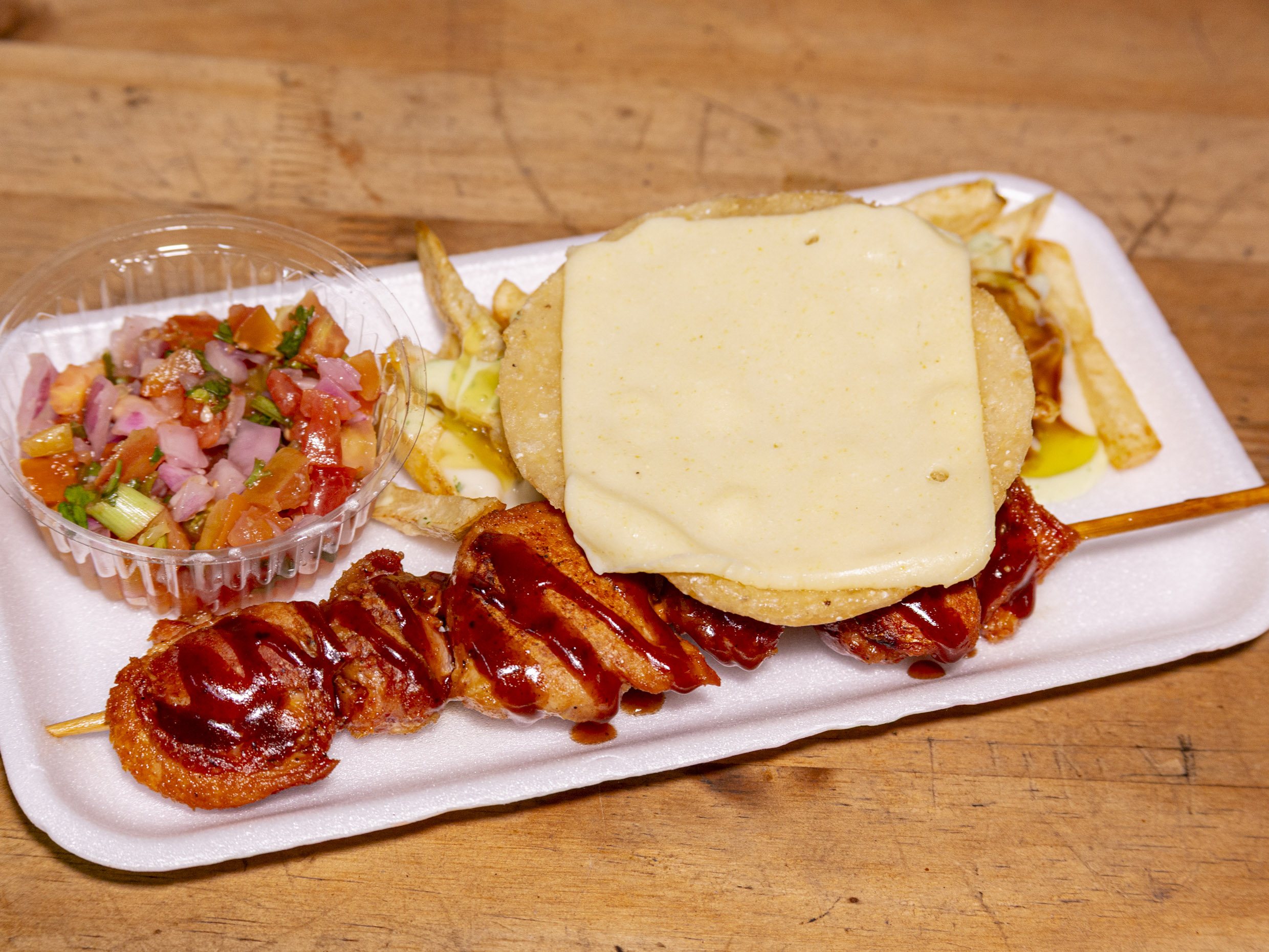 Chuzo de pollo asado, con porcion de papas a la francesas, ensalada pico de gallo, arepa asada con queso mozarella