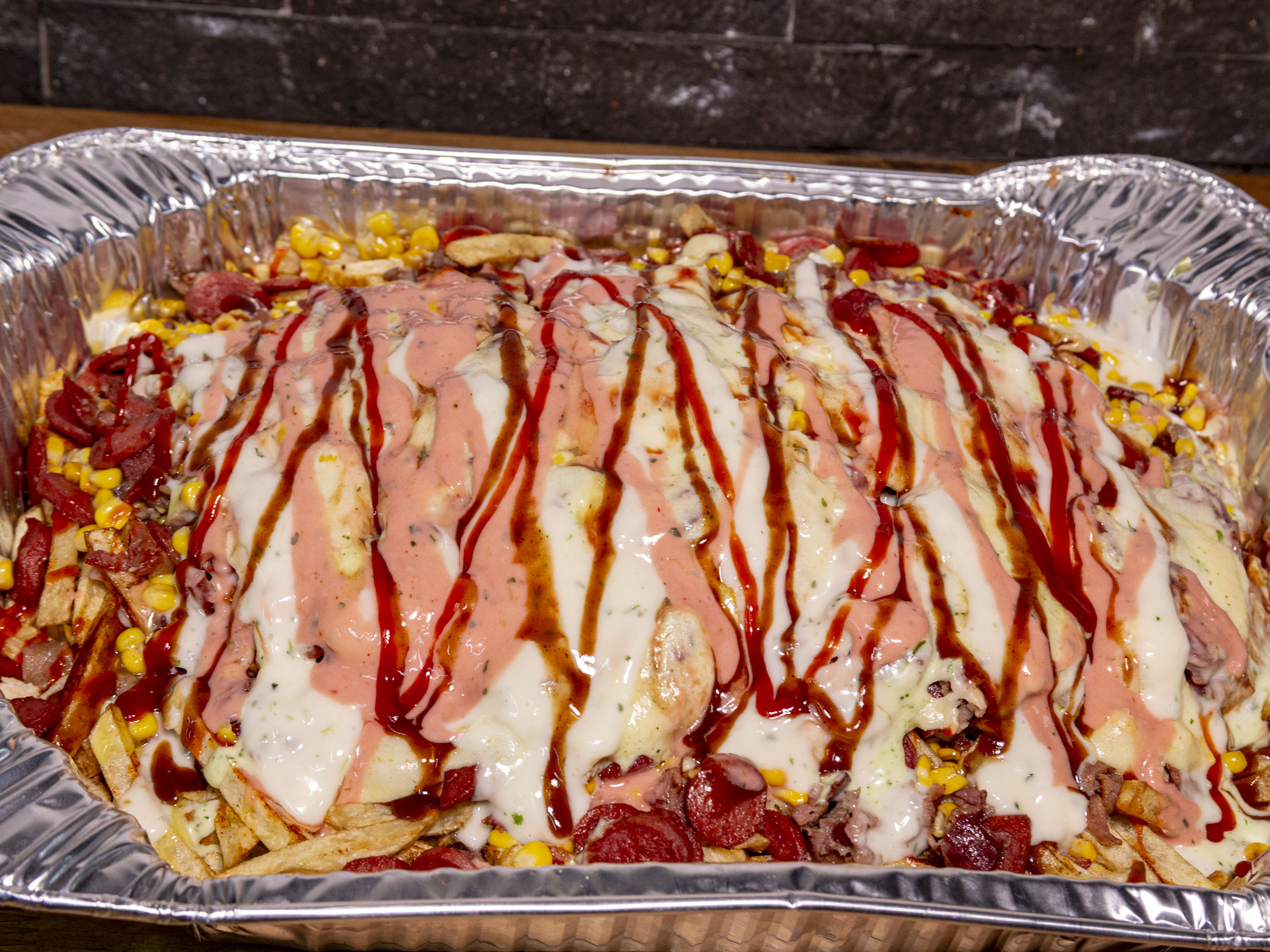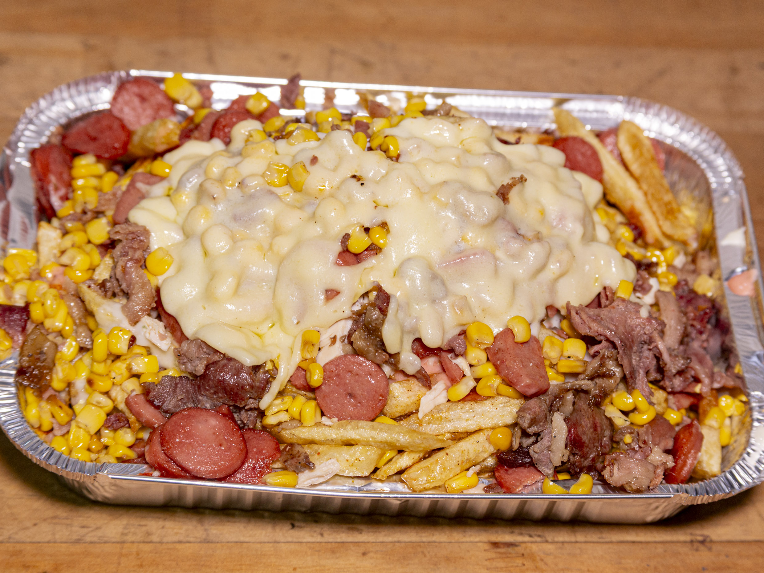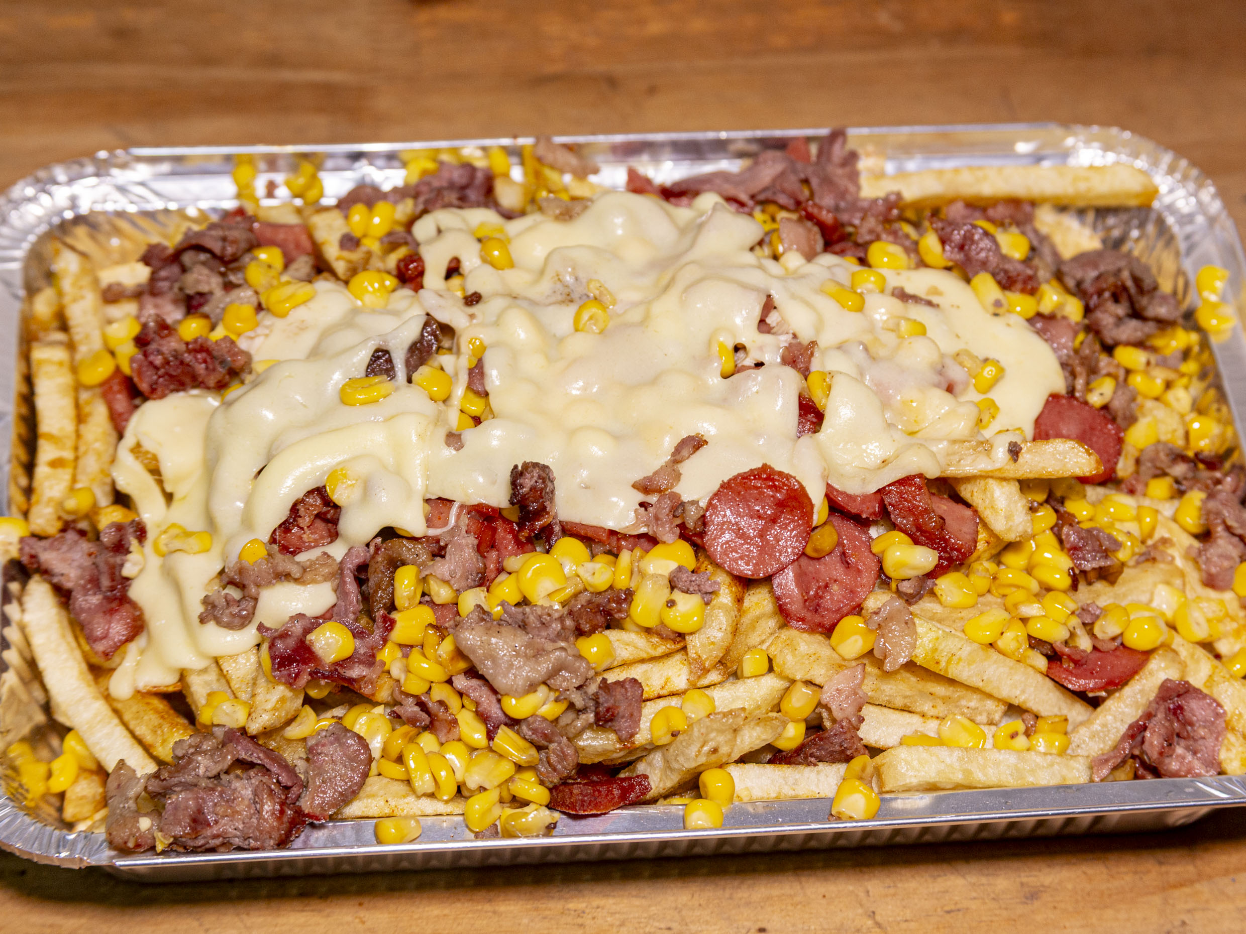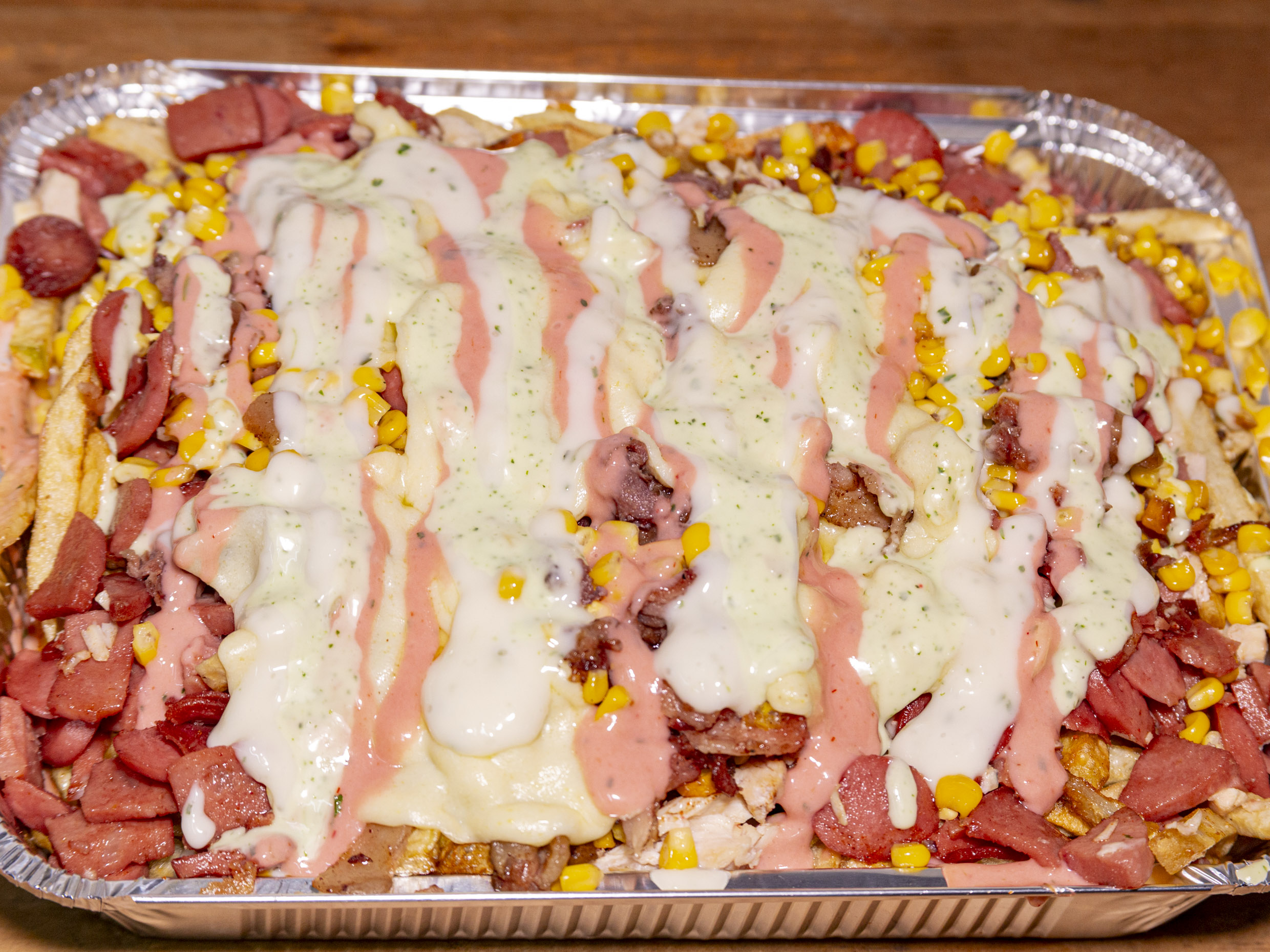 Papas mini maiz con, papas a la francesas, revuelto de salchichas picadas con pollo desmechado, salchichón cervecero, maiz, acompañado de salsas a eleccion