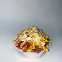 Picada para aproximadamente 4 personas: papas a la francesa con doble porción de revuelto de salchichas picadas y pollo desmechado, doble maíz tierno, doble queso fundido y doble tocineta. Acompañada de salsas a elección. 🍟🥓🧀