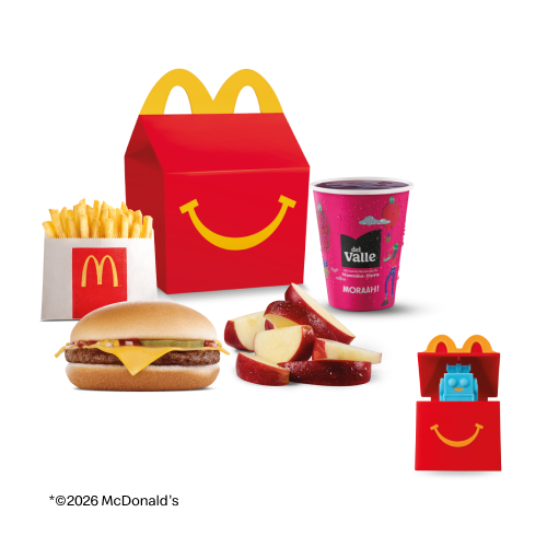 Elige tu Cajita Feliz™ con Hamburguesa Con Queso con carne 100% de res de 50gr, salsa de tomate, mostaza, cebolla triturada y pepinillos con papas kids, jugo Del Valle Moraah, cascos de manzana y juguete.