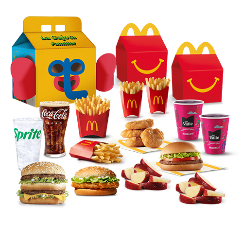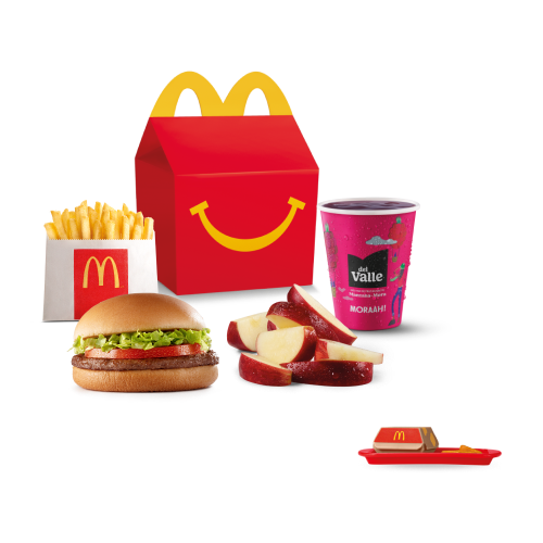 Elige tu Cajita Feliz™ con McFiesta Jr con carne 100% de res de 50gr, salsa de tomate, lechuga y tomate con papas kids, jugo Del Valle Moraah, cascos de manzana y juguete.