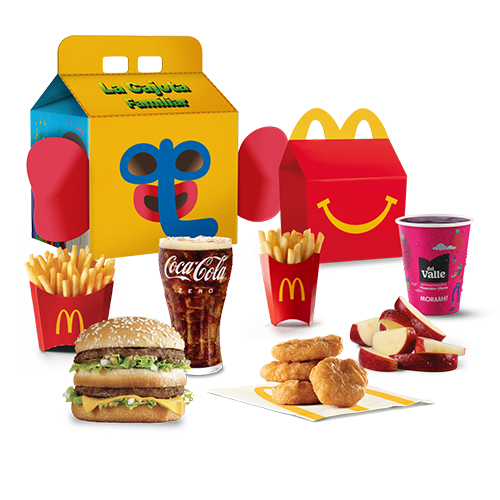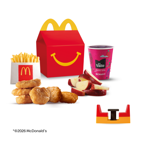 Elige tu Cajita Feliz con 6 piezas de nuggets 100% de pechuga de pollo apanadas con papas kids, jugo Del Valle Moraah, cascos de Manzana y juguete.