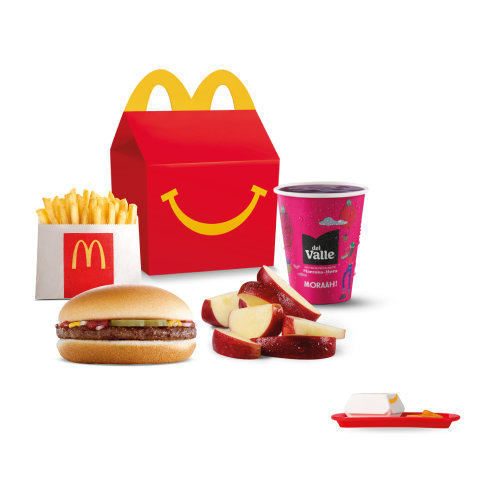 Elige tu Cajita Feliz™ con Hamburguesa Sencilla con carne 100% de res de 50gr, salsa de tomate, mostaza, cebolla triturada y pepinillos con papas kids, jugo Del Valle Moraah, cascos de manzana y juguete.
