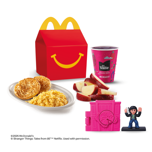 Elige tu Cajita Feliz™ de huevos revueltos de gallina libre de jaula, jugo Del Valle Moraah, cascos de manzana y juguete.