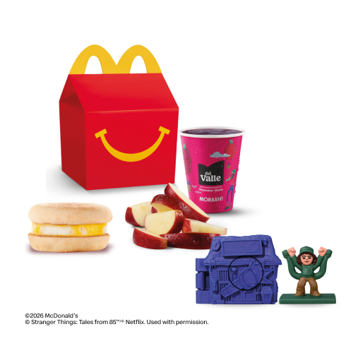 Elige tu Cajita Feliz™ con Egg McMuffin, jugo Del Valle Moraah, cascos de manzana y juguete.