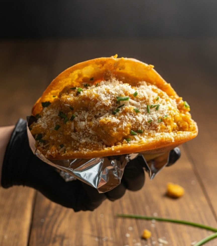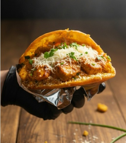 Una fusión colombo-asiática: arepa frita, dorada y crujiente, rellena de pollo en una salsa cremosa de mantequilla y especias suaves, coronada con queso mozzarella fundido que se derrite al primer bocado.