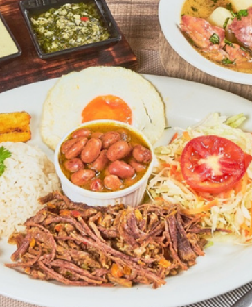 Carne desmechada guisada, servida con sopa, arroz, frijol, huevo frito, tajada de maduro, ensalada y jugo del día.