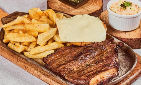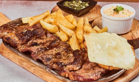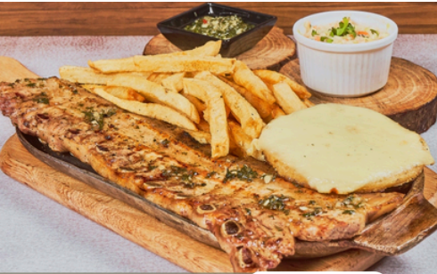 Tradicional churrasco asado al carbón, servido con papas a la francesa, arepa con queso y ensalada.